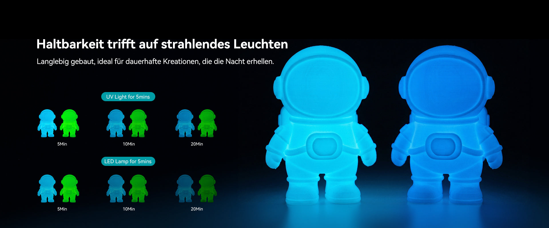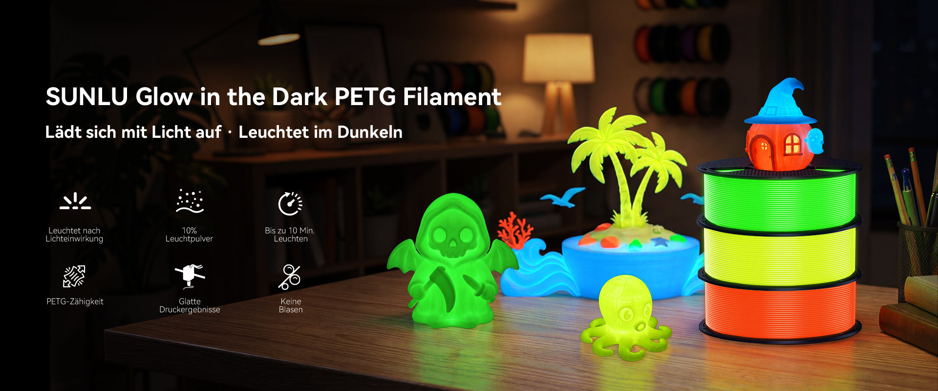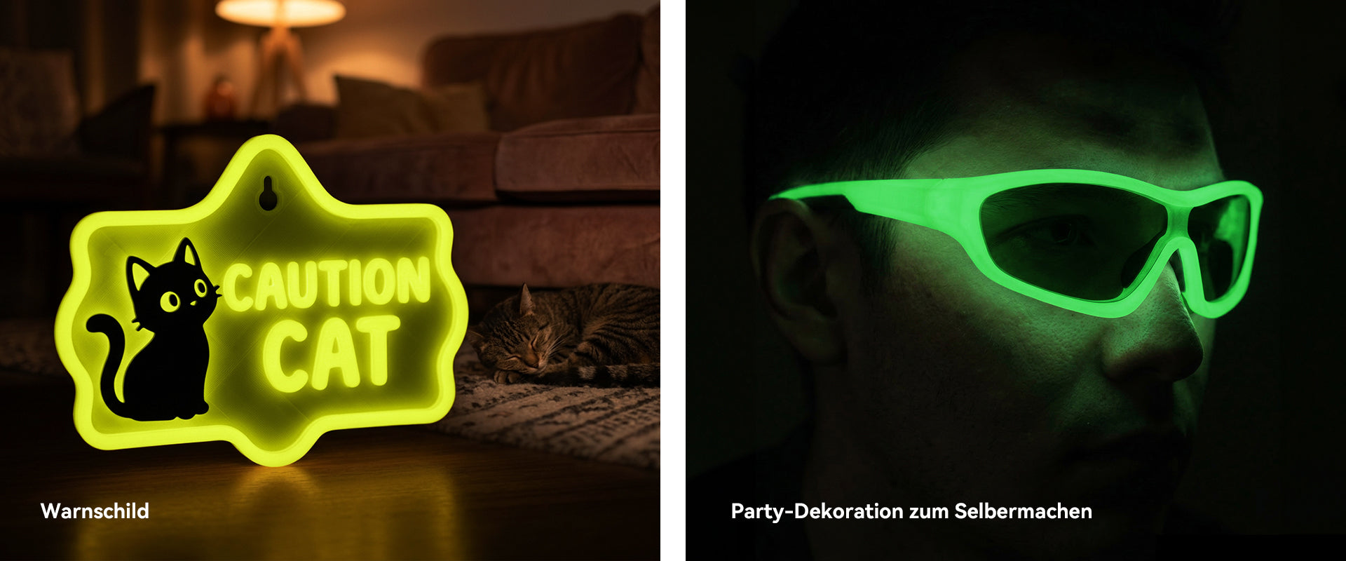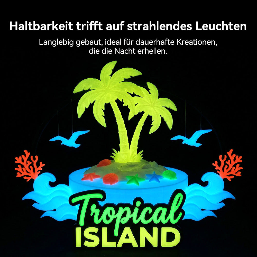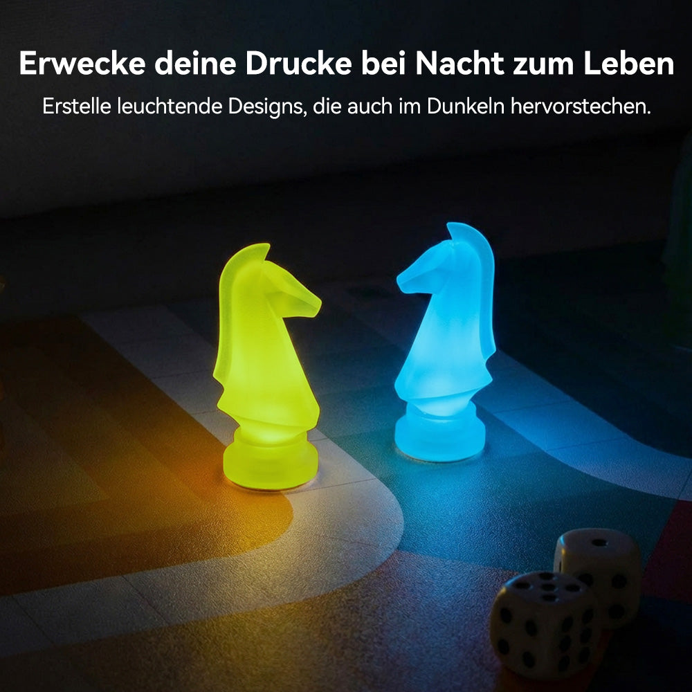 10 % Leuchtpulver, Bright Night Glow: Lädt sich unter Lichteinwirkung auf und leuchtet im Dunkeln bis zu 10 Minuten lang sichtbar, vergleichbar mit Glow-PLA.