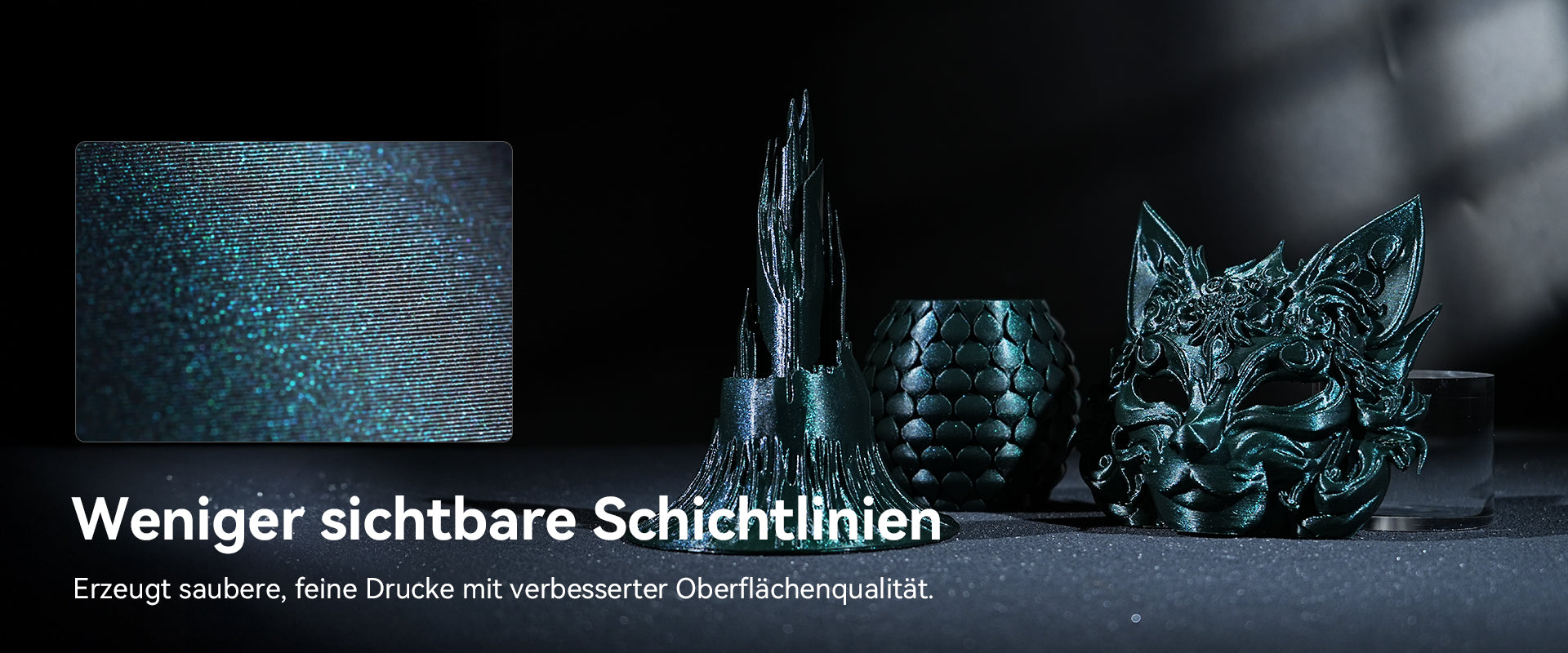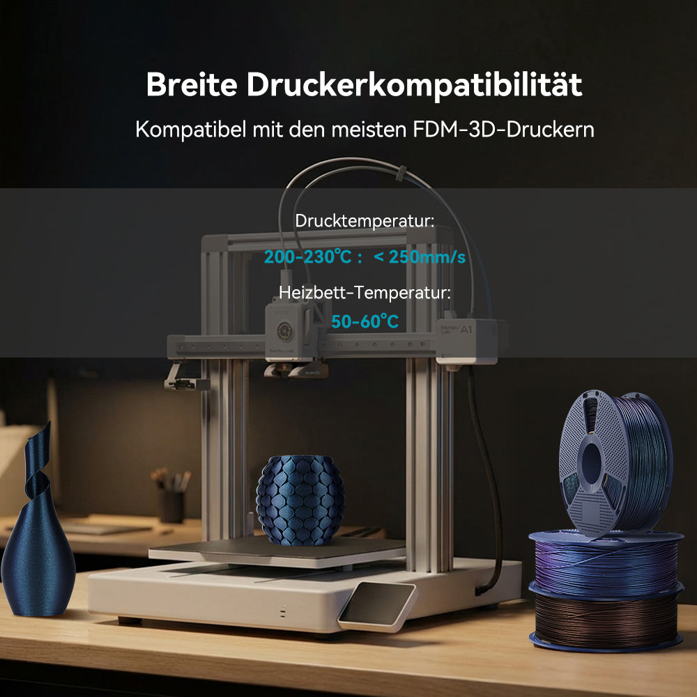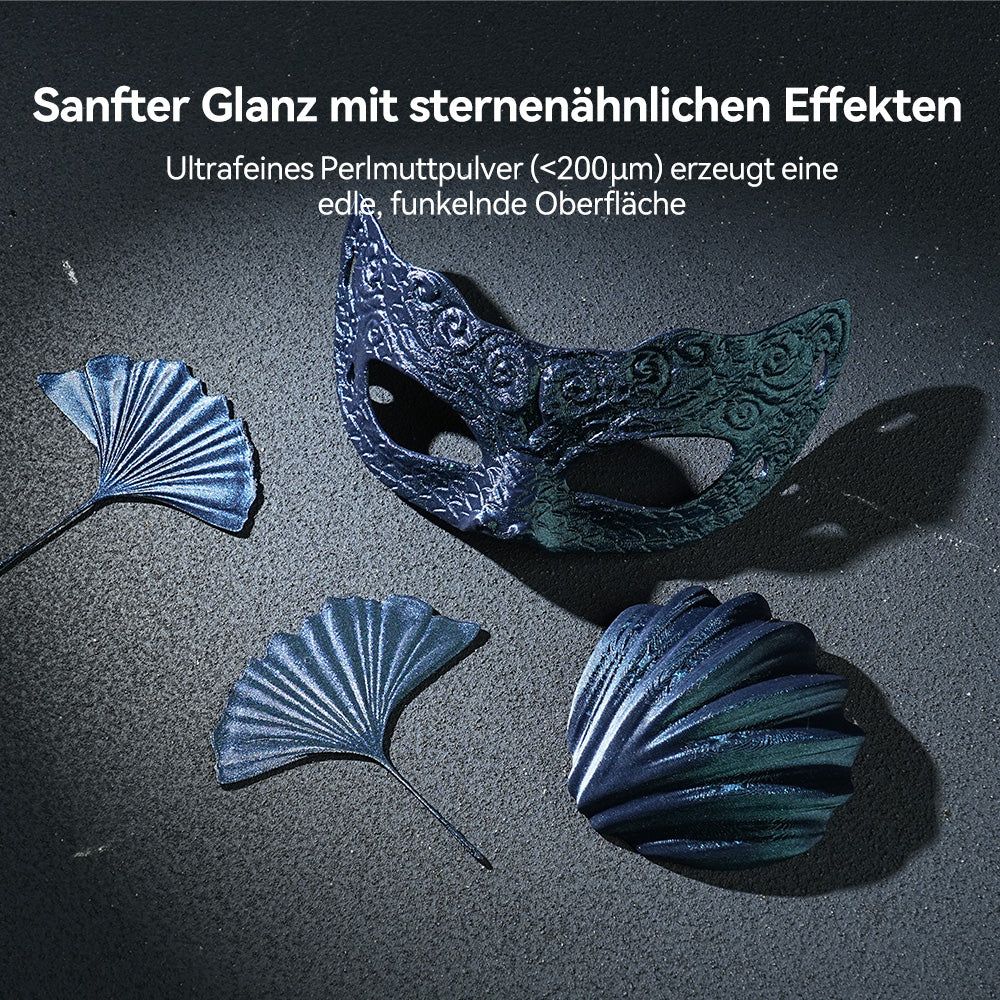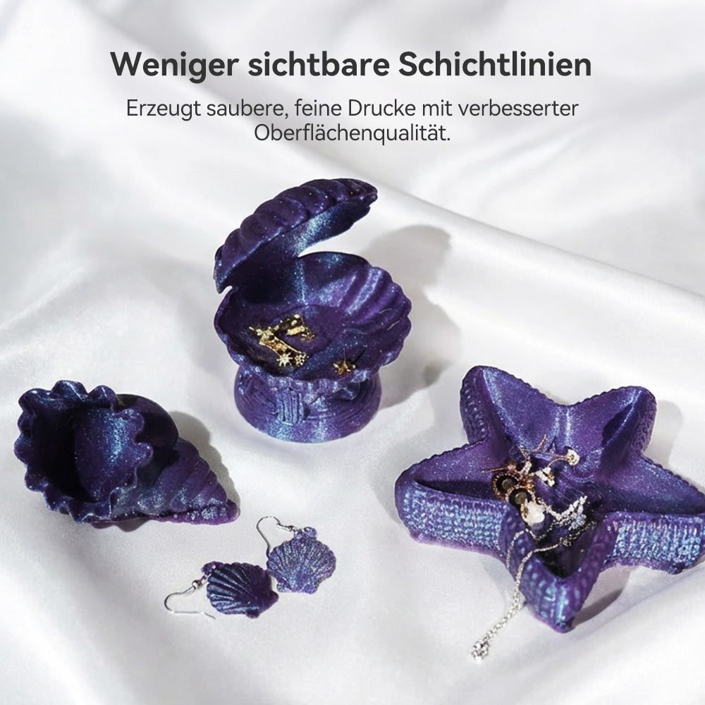 Nahtlose Oberfläche mit ultrafeinen Details: Dieses Filament wurde entwickelt, um Schichtlinien zu minimieren und Ihren Kreationen direkt nach dem Druck ein raffiniertes, professionelles Aussehen zu verleihen. Die schimmernde Perlmuttoptik unterstreicht die glatte Oberfläche und lässt jede Kurve, Kante und Textur mit Eleganz und Präzision hervorstechen. Perfekt für Kreative, die sowohl Wert auf Schönheit als auch auf Qualität legen.