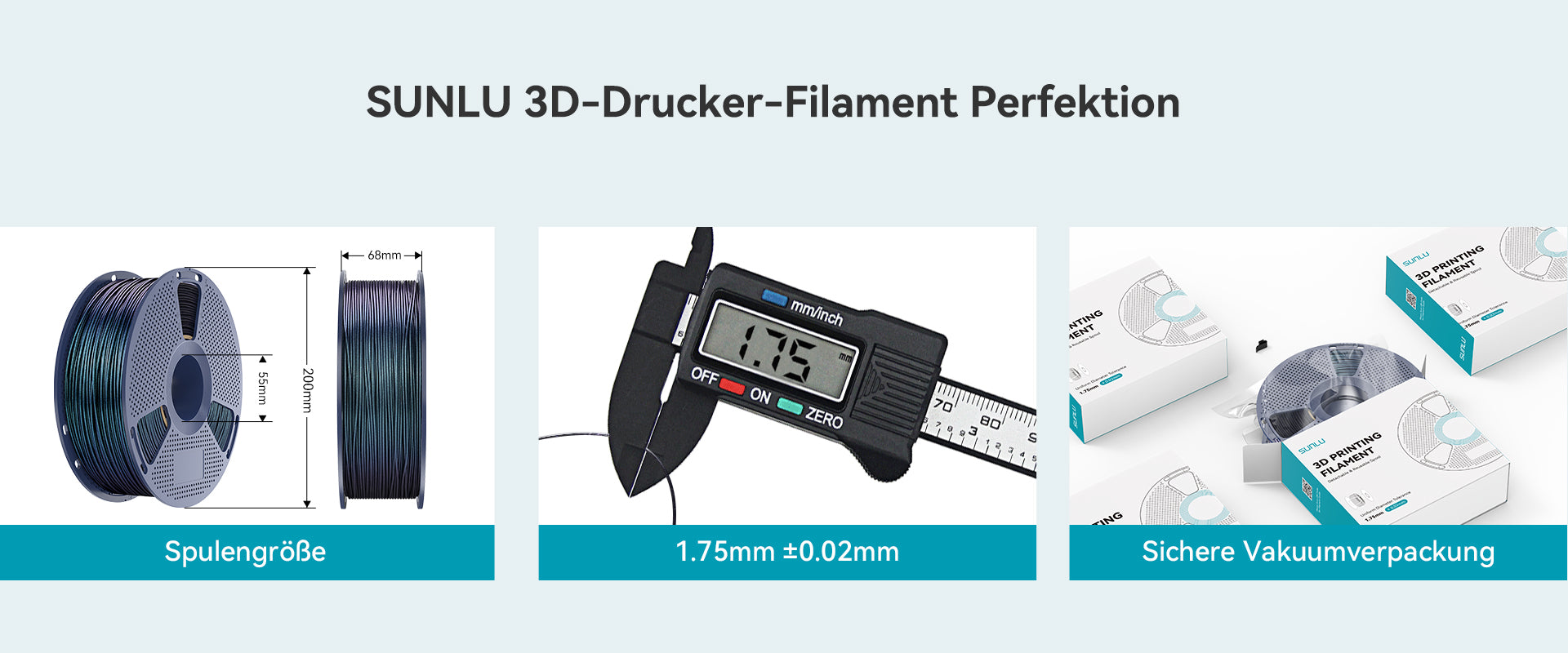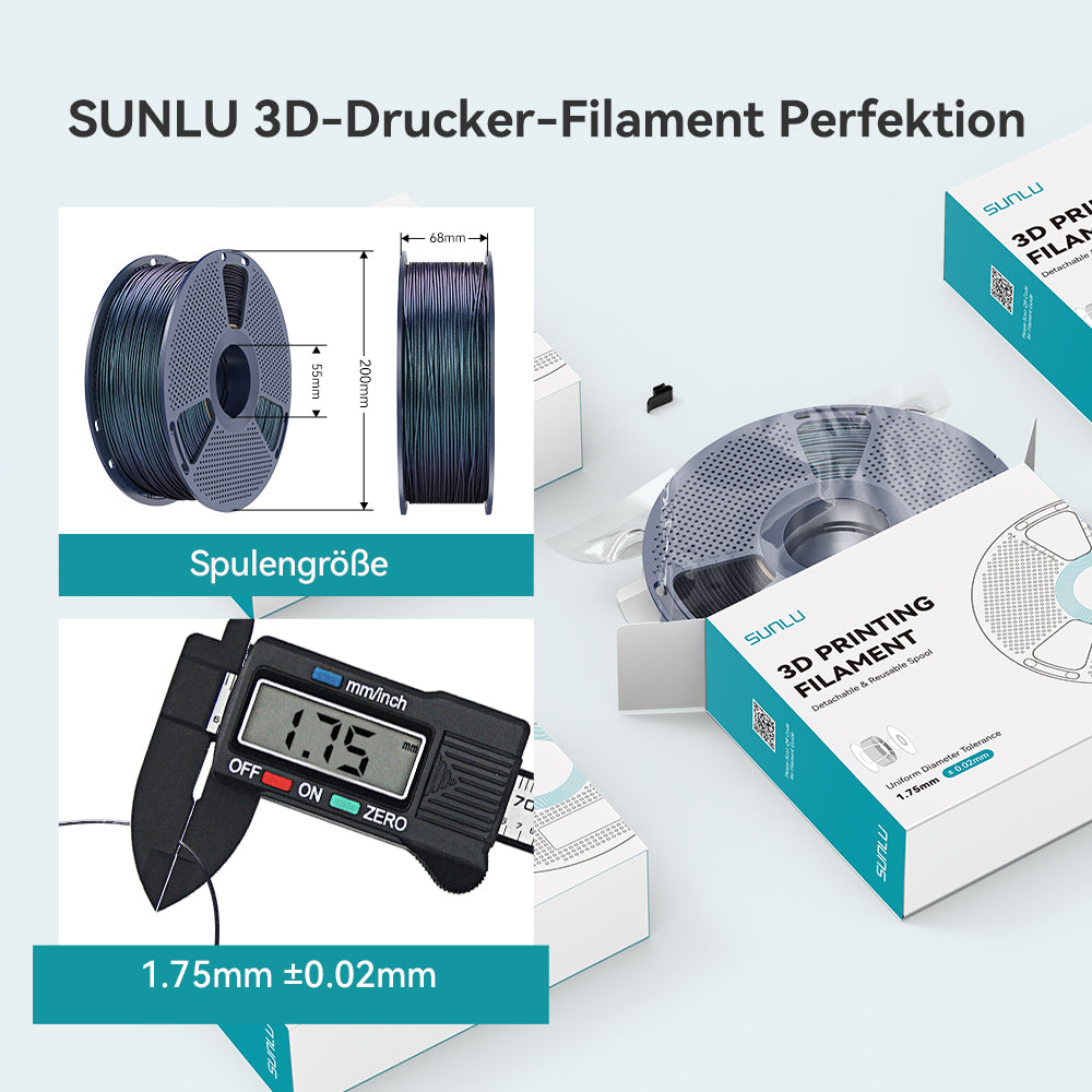 SUNLU 3D-Drucker-Filament mit einer Maßgenauigkeit von +/- 0,02 mm. SUNLU-Filament ist aufgrund des geringen Durchmesserfehlers breit kompatibel. Geringe Schrumpfung und gleichmäßiger Durchmesser (±0,02 mm) sorgen für einen reibungslosen Vorschub und zuverlässige Druckergebnisse. Funktioniert perfekt mit den meisten FDM-3D-Druckern (Bambu Lab, Creality, Prusa, Anycubic usw.).