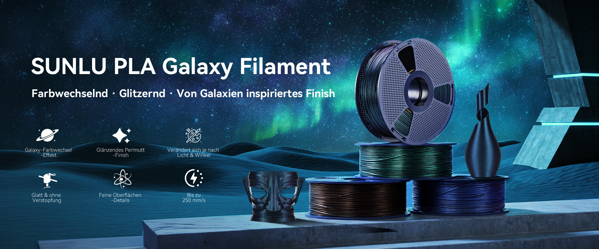 Faszinierender, von der Galaxie inspirierter Farbwechsel: Inspiriert von der Schönheit der Milchstraße kombiniert das SUNLU PLA Galaxy-Filament einen tiefen kosmischen Hintergrund mit funkelnden Sterneneffekten. Dank seines ultrafeinen, farbwechselnden Perlglanzpulvers (Partikelgröße <200 µm) zeigen Ihre 3D-Drucke unter verschiedenen Lichtwinkeln dynamische Farbwechsel. Das Ergebnis ist ein schillerndes, sternenklares Finish, das jeden Druck außergewöhnlich und wirklich einzigartig macht.