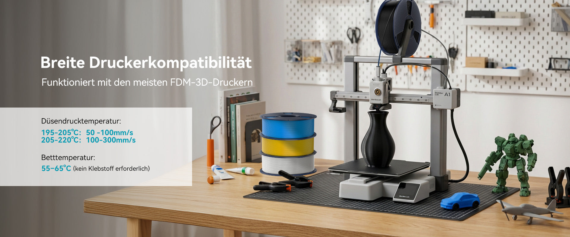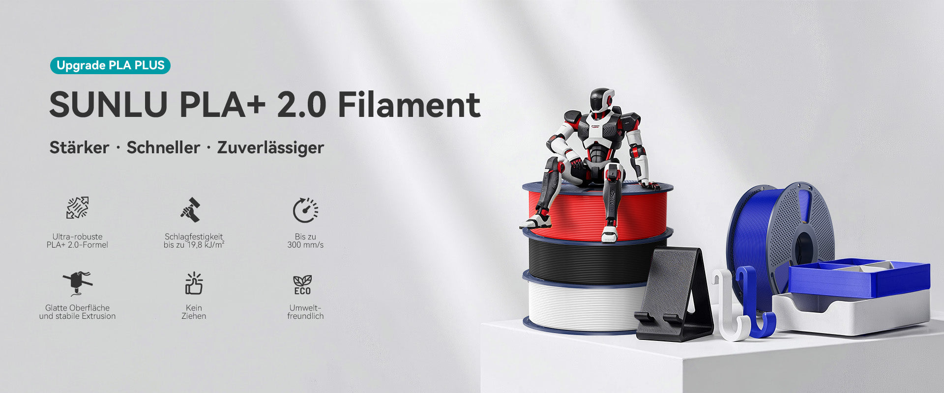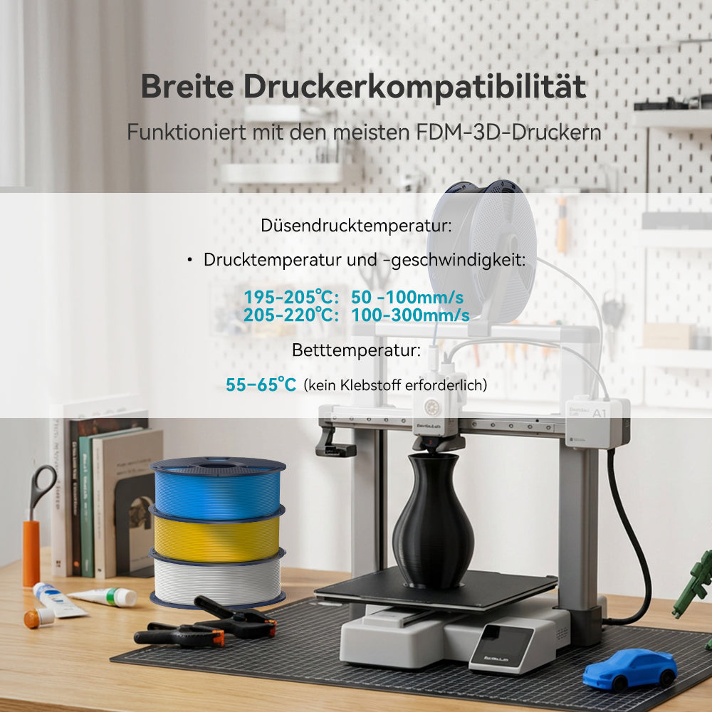 PLA+ 2.0 unterstützt Druckgeschwindigkeiten von bis zu 300 mm/s und verkürzt die Produktionszeit deutlich, ohne die Druckqualität zu beeinträchtigen. Besonders ideal für großvolumige Projekte und enge Zeitpläne.