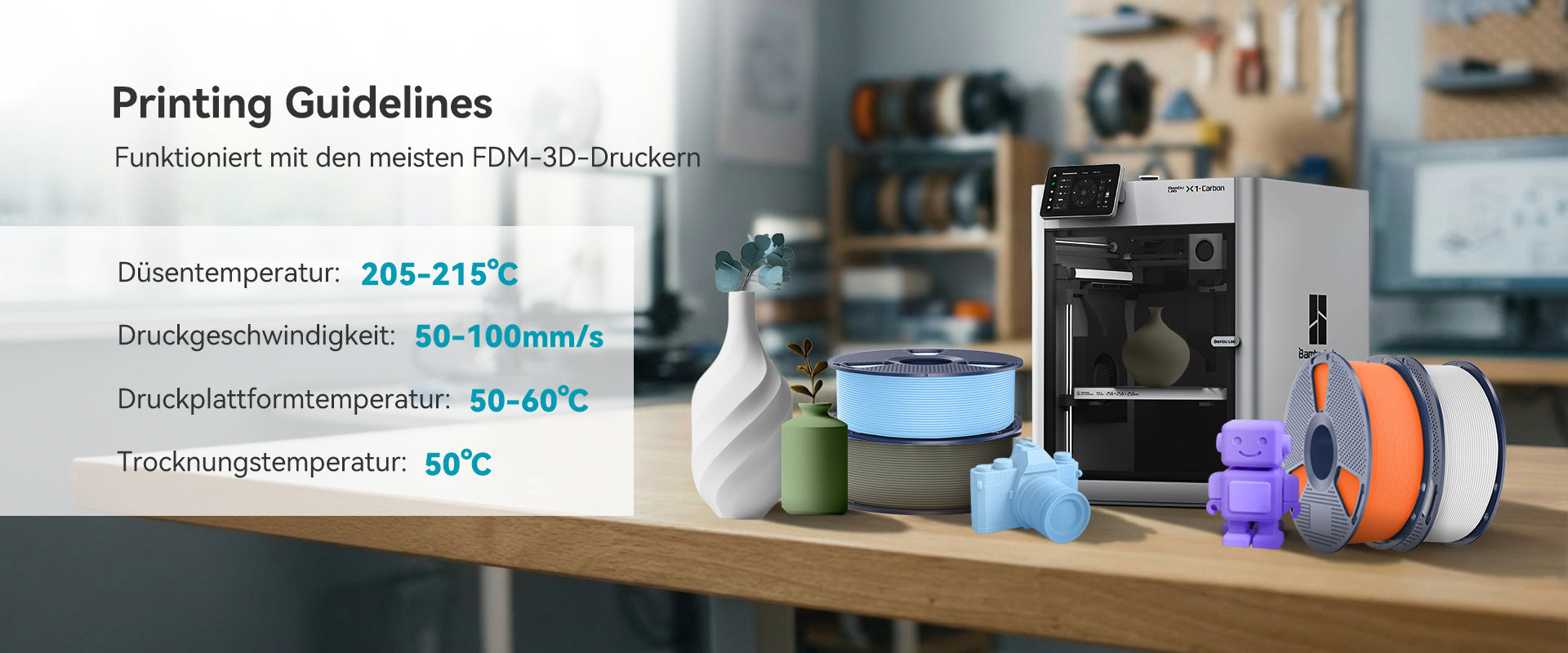 Düsen-Temperatur 205 - 215 °C: 50–100 mm/s 215 - 245 °C: 100–300 mm/s
