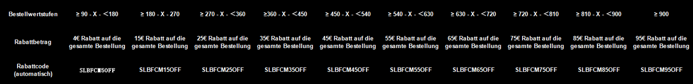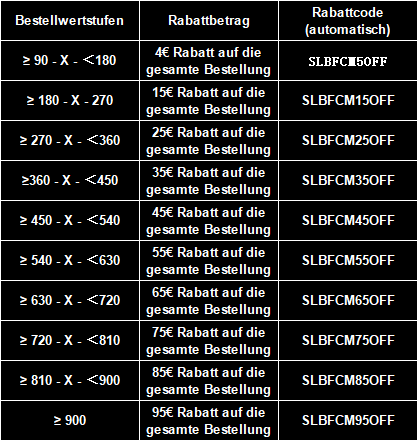 (1) Rabatt auf Bestellungen im gesamten Shop: Wenn der Gesamtbetrag der berechtigten Produkte in Ihrer Bestellung (ausgenommen technische Filamente und Elektronikprodukte) den für Rabatte erforderlichen Mindestbetrag erreicht, wird der Rabatt automatisch an der Kasse abgezogen. Bitte beachten Sie: Technische Filamente und Elektronikprodukte werden bei der Berechnung des Mindestbestellwerts nicht berücksichtigt.