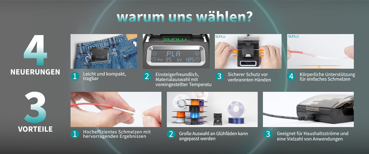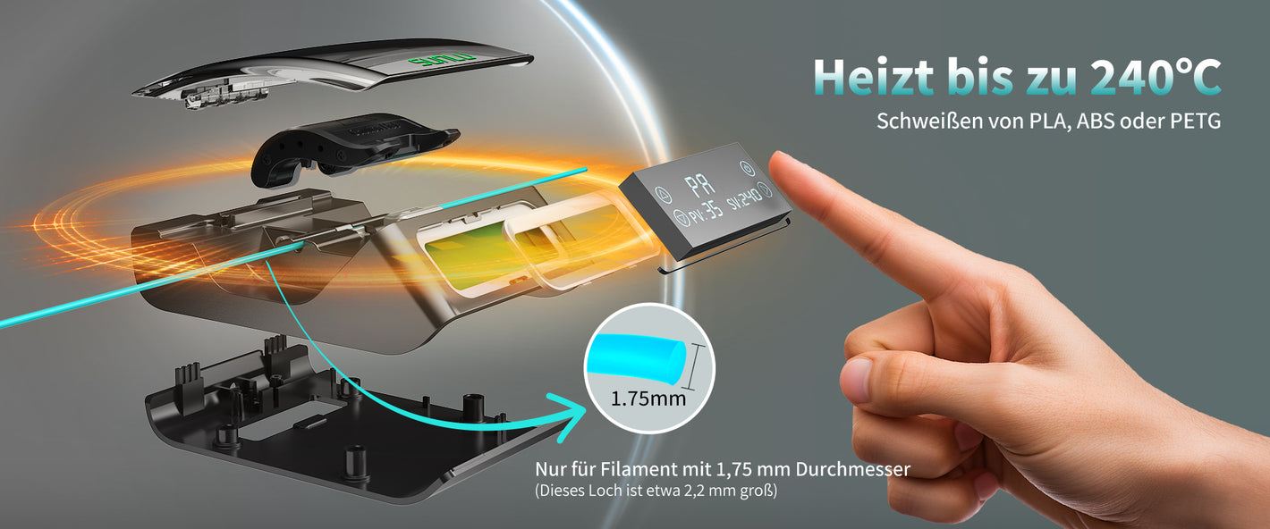 [Einfache Bedienung] Benutzerfreundliches Design mit einer einfachen, intuitiven Schnittstelle. Netzadapter nicht enthalten. Verwenden Sie mindestens einen 5V 2A-Adapter, um Probleme beim Einschalten zu vermeiden. Wählen Sie die passenden Einstellungen je nach Filamenttyp und folgen Sie den detaillierten Anweisungen und Video-Tutorials. Perfekt für Anfänger, da keine komplizierten Einstellungen erforderlich sind. Die Fusion ist in 10-15 Sekunden abgeschlossen. (Um eine gute Verbindung zu gewährleisten, wird empfohlen, den Faden vor dem Verkleben zu trocknen, um sicherzustellen, dass die Fäden nicht feucht sind).