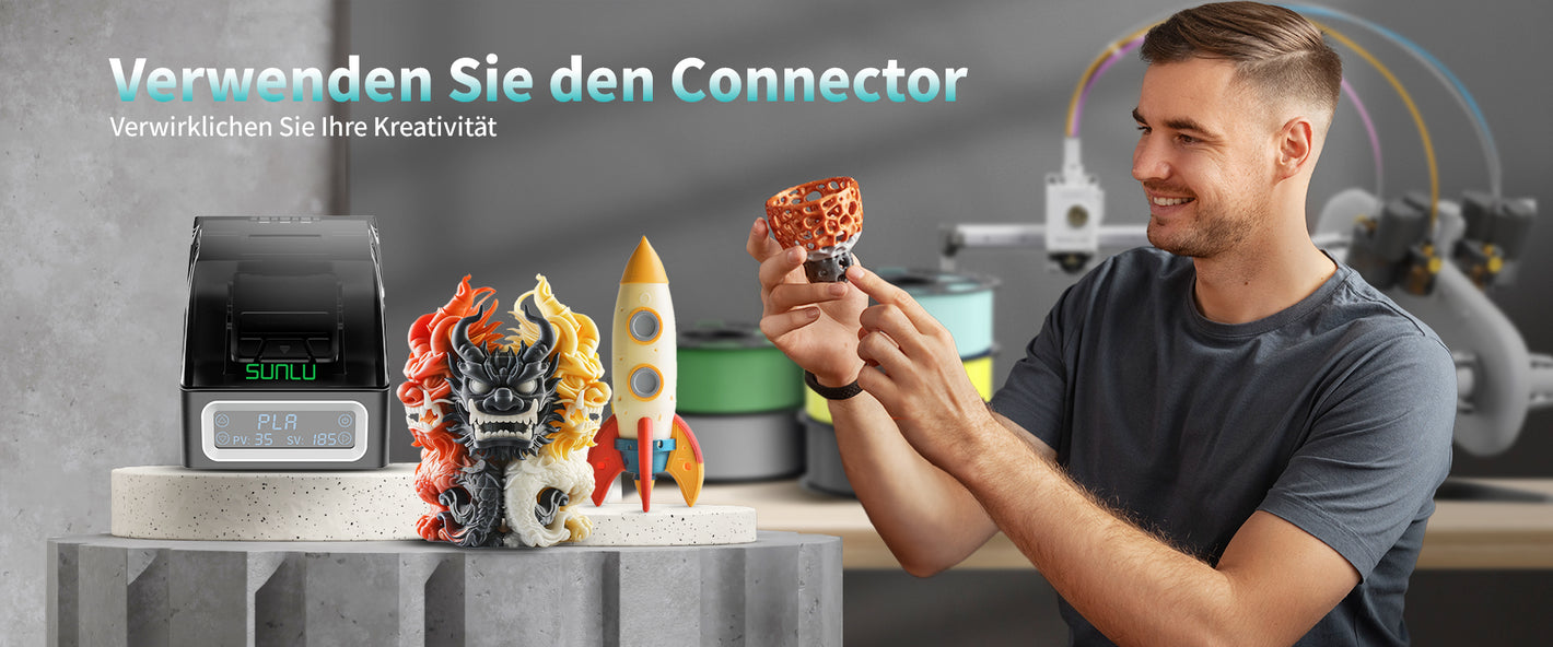 [Kreatives DIY, mehrfarbiger Druck] SUNLU Filament Connector FC01 verschmelzen Sie einfach Filamente desselben Materials, aber unterschiedlicher Farben. Erstellen Sie lebendige, personalisierte 3D-Drucke, ob für mehrfarbige Modelle oder Farbverläufe. Entfesseln Sie Ihre Kreativität und machen Sie jedes Stück einzigartig.