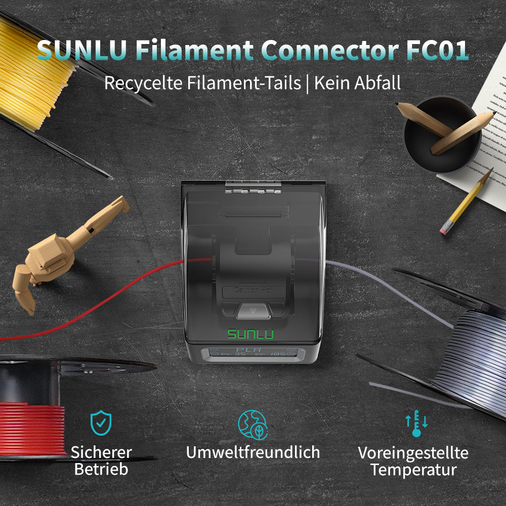 [Zero Waste] SUNLU Filament Connector FC01 vollständige Nutzung von übrig gebliebenem 3D-Druck-Filament, um Abfall zu minimieren und Kosten zu sparen. Der Fusionsspleißer reduziert den Abfall von Endmaterial und hilft Anwendern, neue Verbrauchsmaterialien zu sparen. Erzielen Sie effiziente Druckprojekte mit null Abfall.