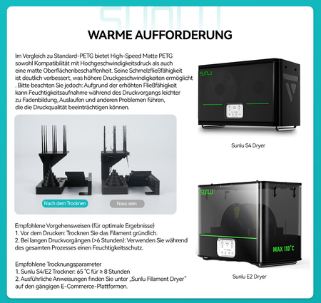 Bitte beachten Sie jedoch: Aufgrund der erhöhten Fließfähigkeit kann die Feuchtigkeitsaufnahme leichter zu Stringing, Oozing und anderen Problemen während des Drucks führen, was die Druckqualität beeinträchtigen kann.