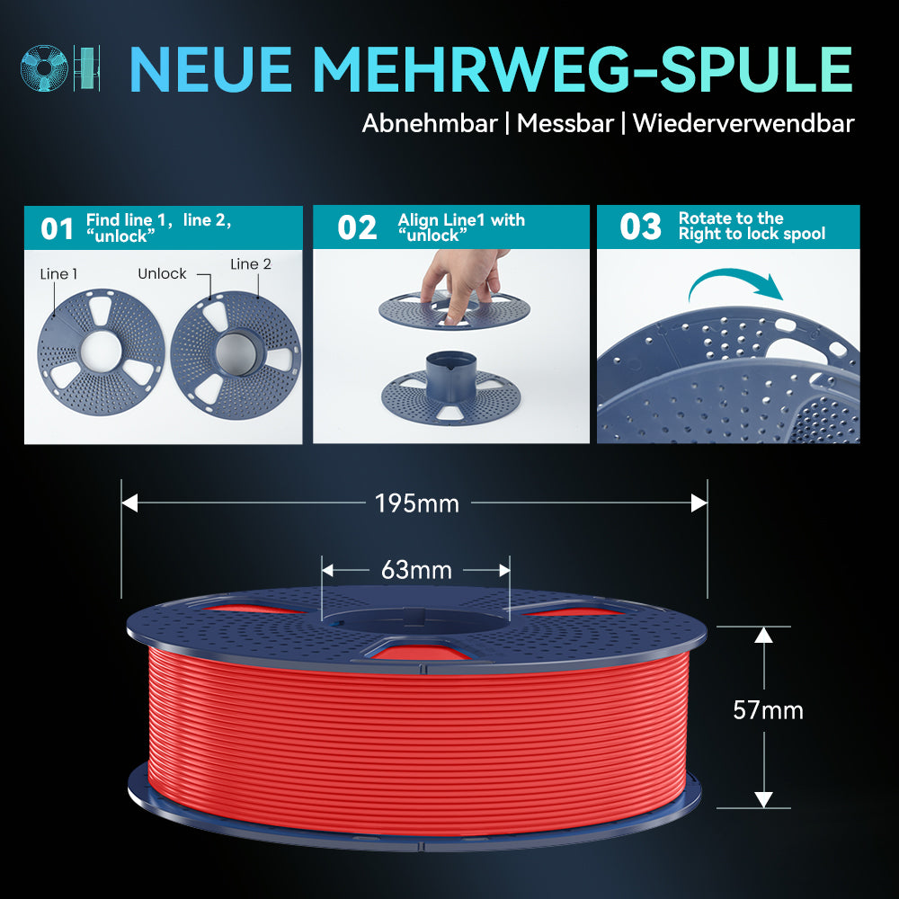 [Spulen-Durchmesser] Spulen-Durchmesser: 8.00„, Spulen-Breite: 2.50“, Spulen-Naben-Loch-Durchmesser: 2.20“. Die Größe der SUNLU Filamentspule eignet sich zum Aufhängen auf vielen 3D-Druckern.