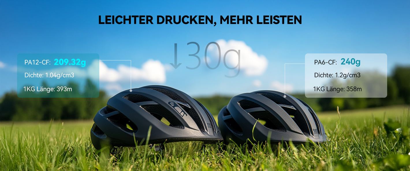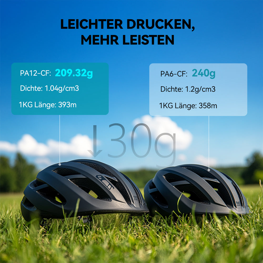Mit einer reduzierten Dichte bietet PA12-CF ein außergewöhnliches Verhältnis von Festigkeit zu Gewicht, ideal für die Herstellung leichter und dennoch robuster Komponenten. Perfekt für Rahmen in der Luft- und Raumfahrt, Automobilteile oder Outdoor-Ausrüstung, bei denen es auf Langlebigkeit ohne zusätzliche Masse ankommt.