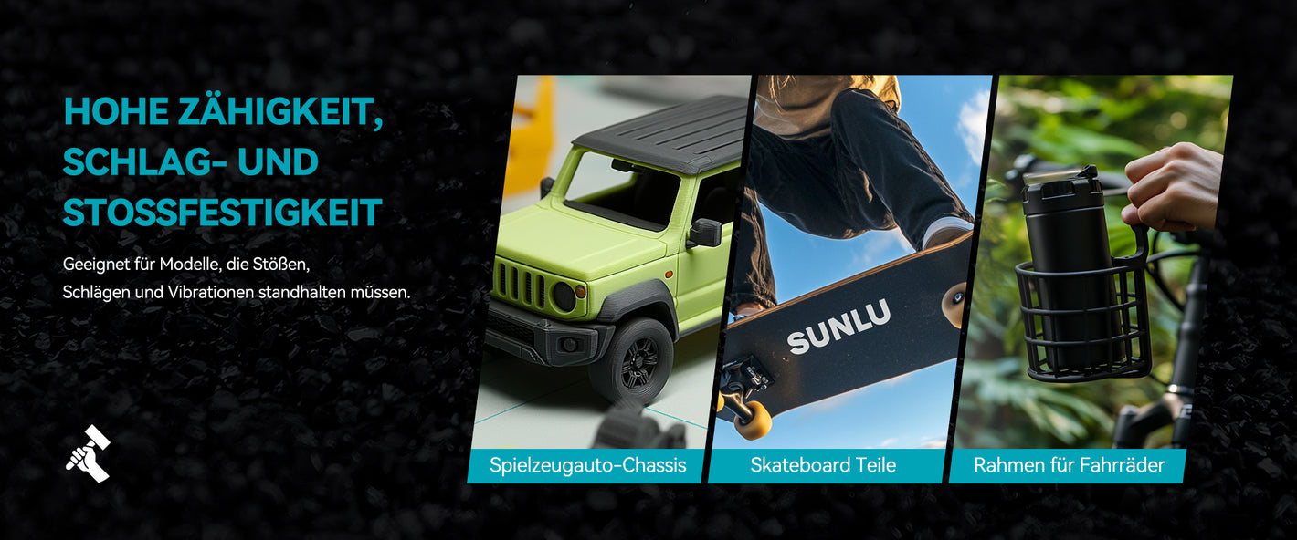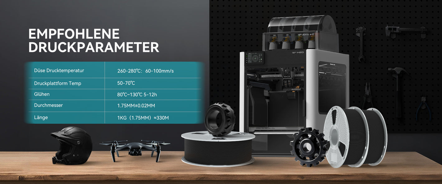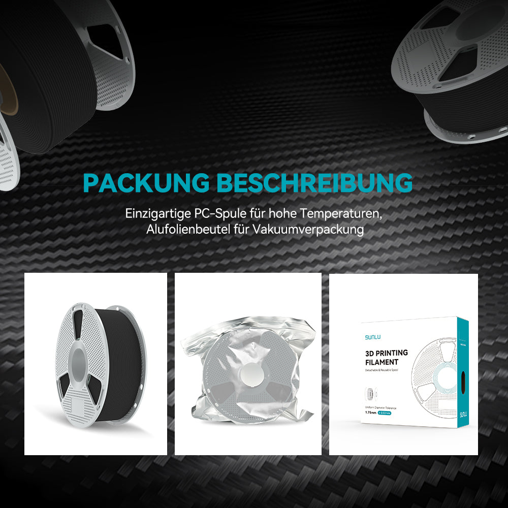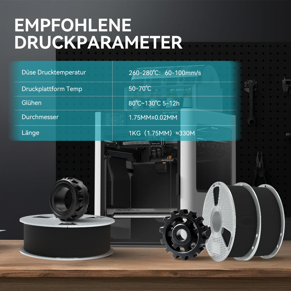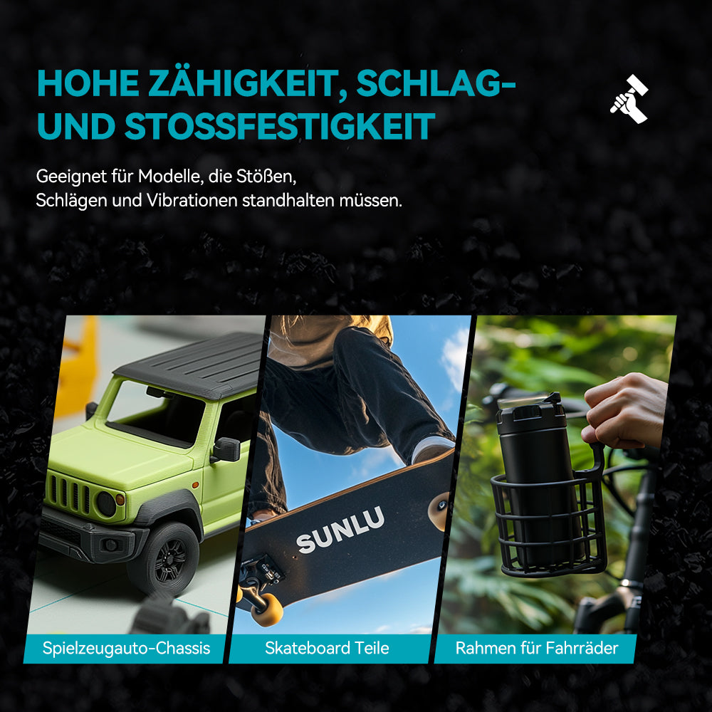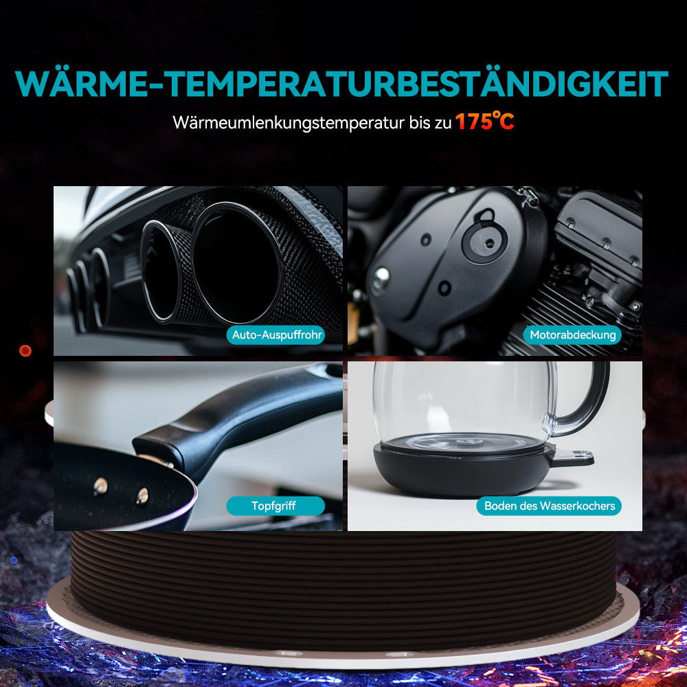 Das mit Kohlenstofffasern verstärkte PA12-CF von SUNLU hält Temperaturen von bis zu 176 °C stand und gewährleistet so Stabilität in anspruchsvollen Umgebungen wie der Automobil- oder Luftfahrtindustrie. Optimiert für den Druck bei 260-280°C mit einem 50-70°C beheizten Bett (verwenden Sie Klebstoff für die Haftung), liefert es auch unter extremer thermischer Belastung zuverlässige Leistung.