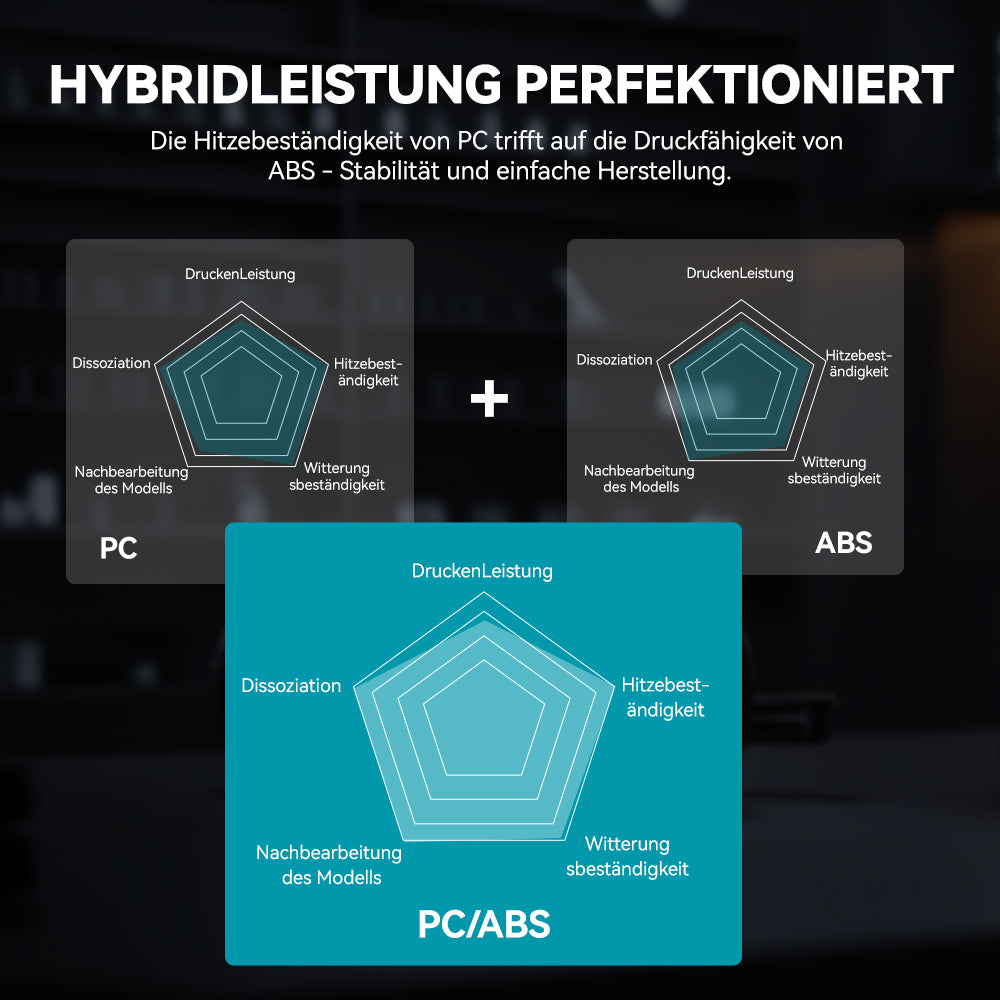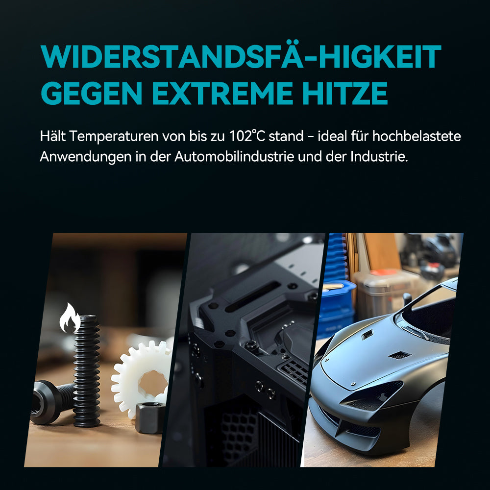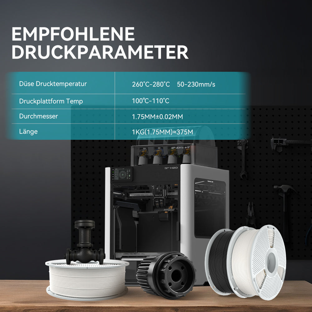 Bitte beachten Sie, dass PC-ABS ein industrielles Filament ist, das eine hohe Drucktemperatur und Kammertemperatur (ca. 90 °C bis 100 °C) erfordert. Vergewissern Sie sich vor dem Kauf, dass Ihr Drucker dafür geeignet ist.