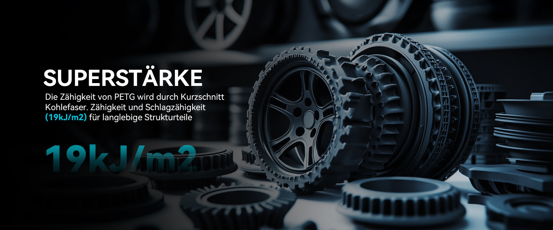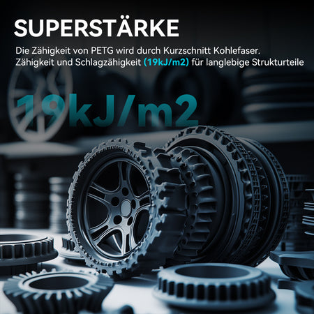 [Verbesserte mechanische Eigenschaften] Die Kohlenstofffaserverstärkung erhöht die Zähigkeit von PETG erheblich und erreicht eine beeindruckende Schlagfestigkeit von 19 kJ/㎡. Dies gewährleistet, dass die gedruckten Modelle langlebig und rissbeständig sind und sich ideal für anspruchsvolle Anwendungen eignen.