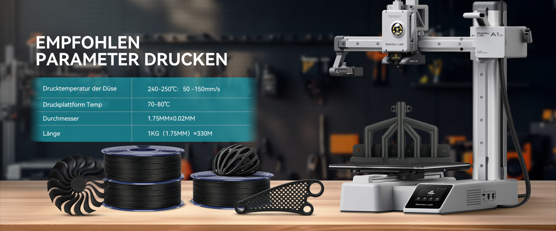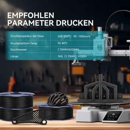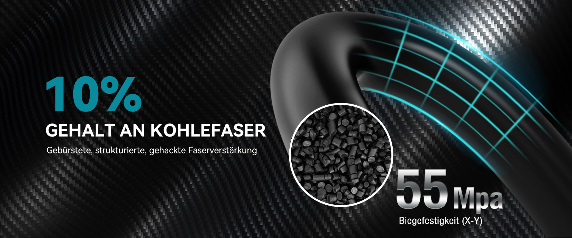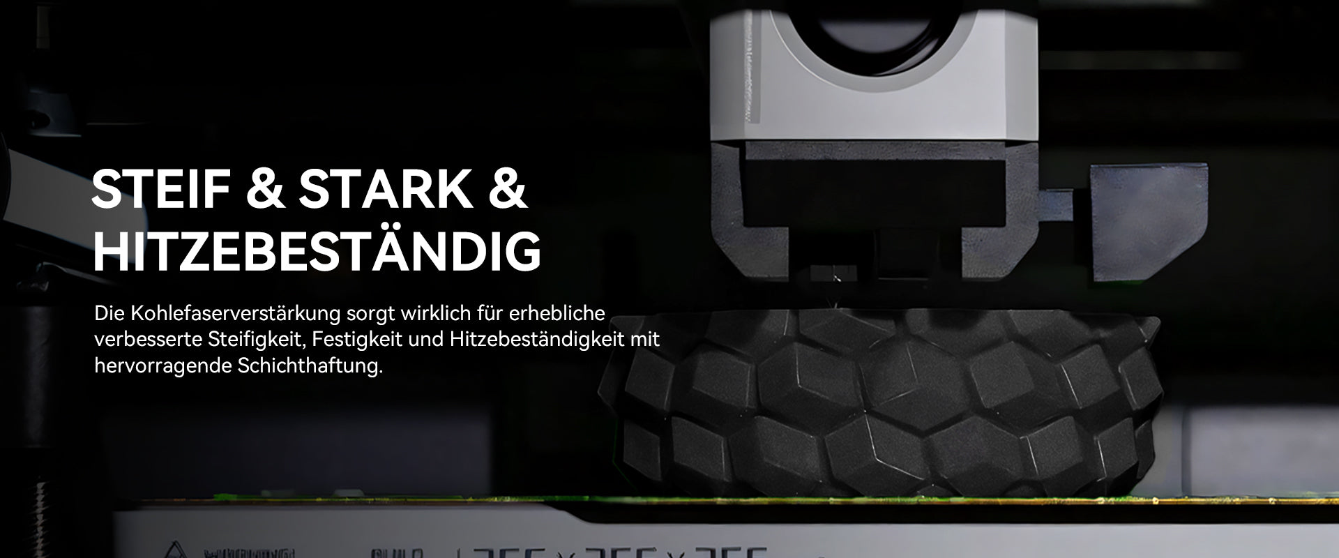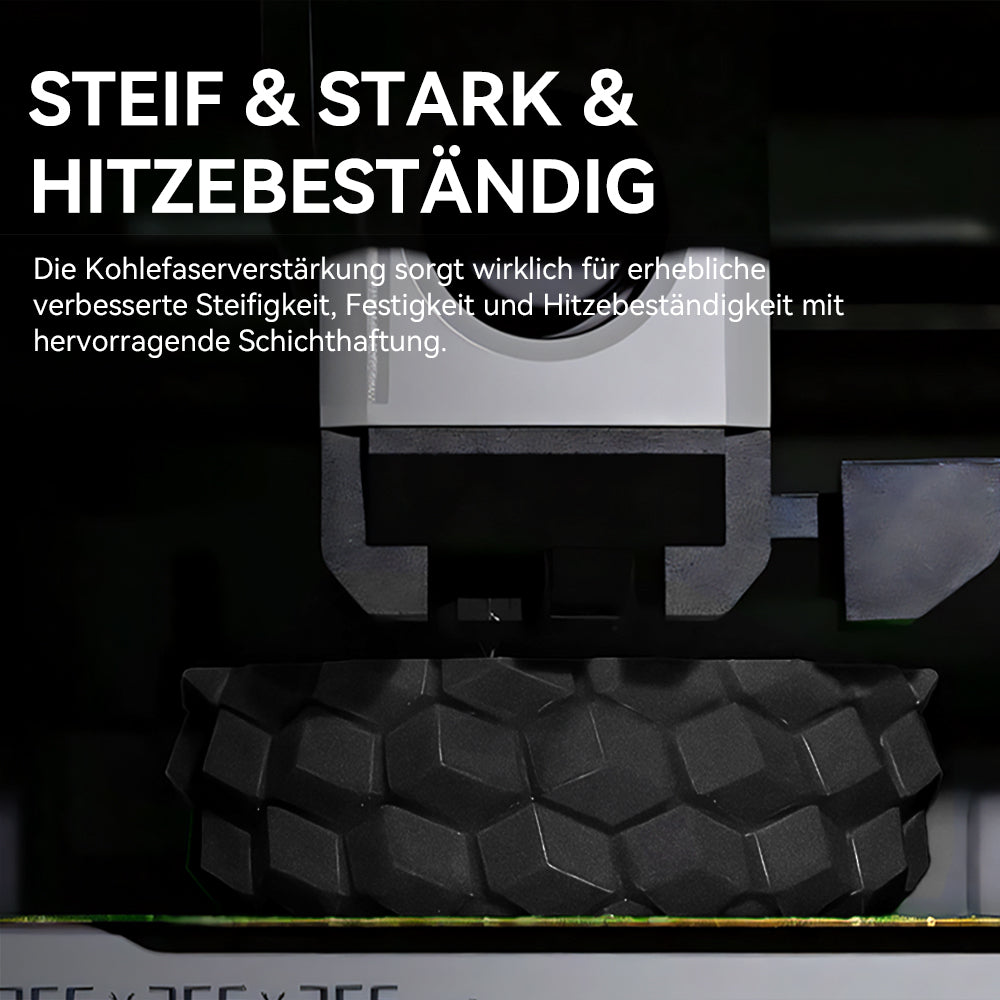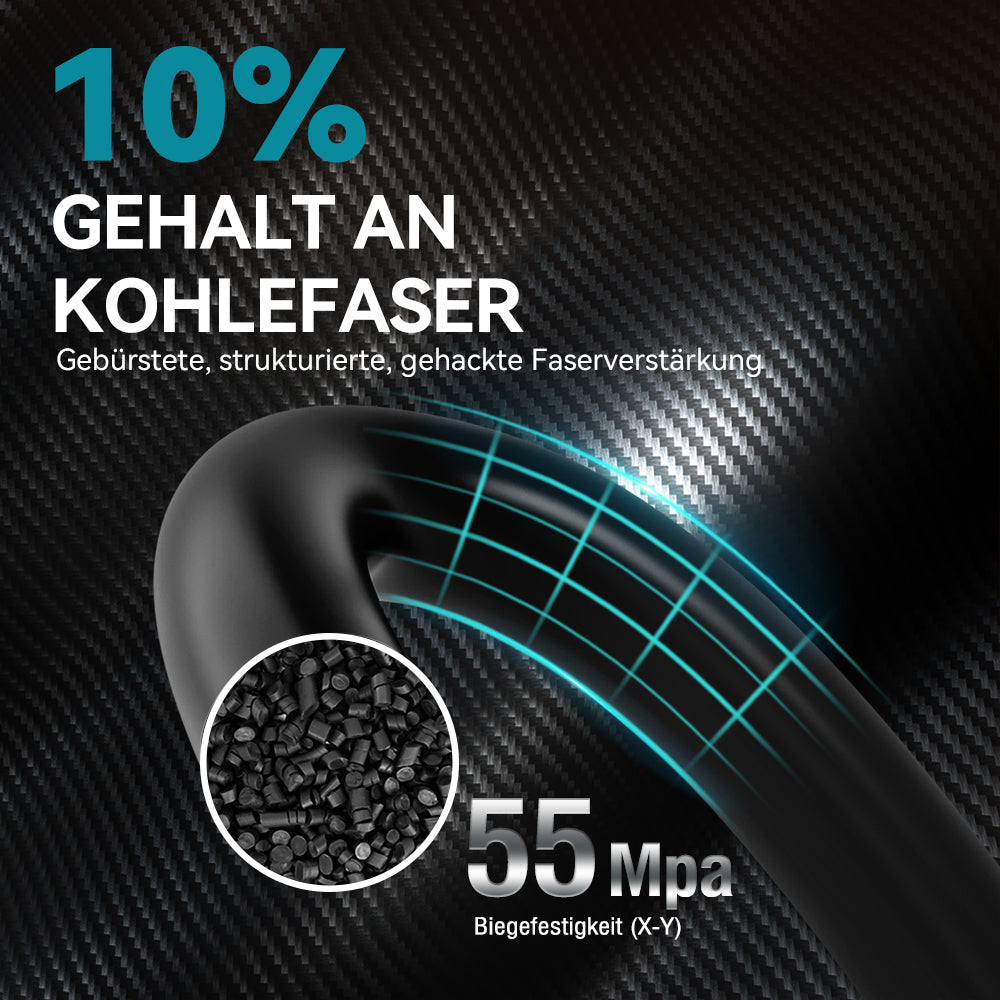 [Hohe Hitzebeständigkeit] Mit einer Wärmeformbeständigkeit von bis zu 70°C bietet PETG-CF eine verbesserte Materialfestigkeit und thermische Stabilität, während die Schlagzähigkeit, für die PETG bekannt ist, erhalten bleibt.