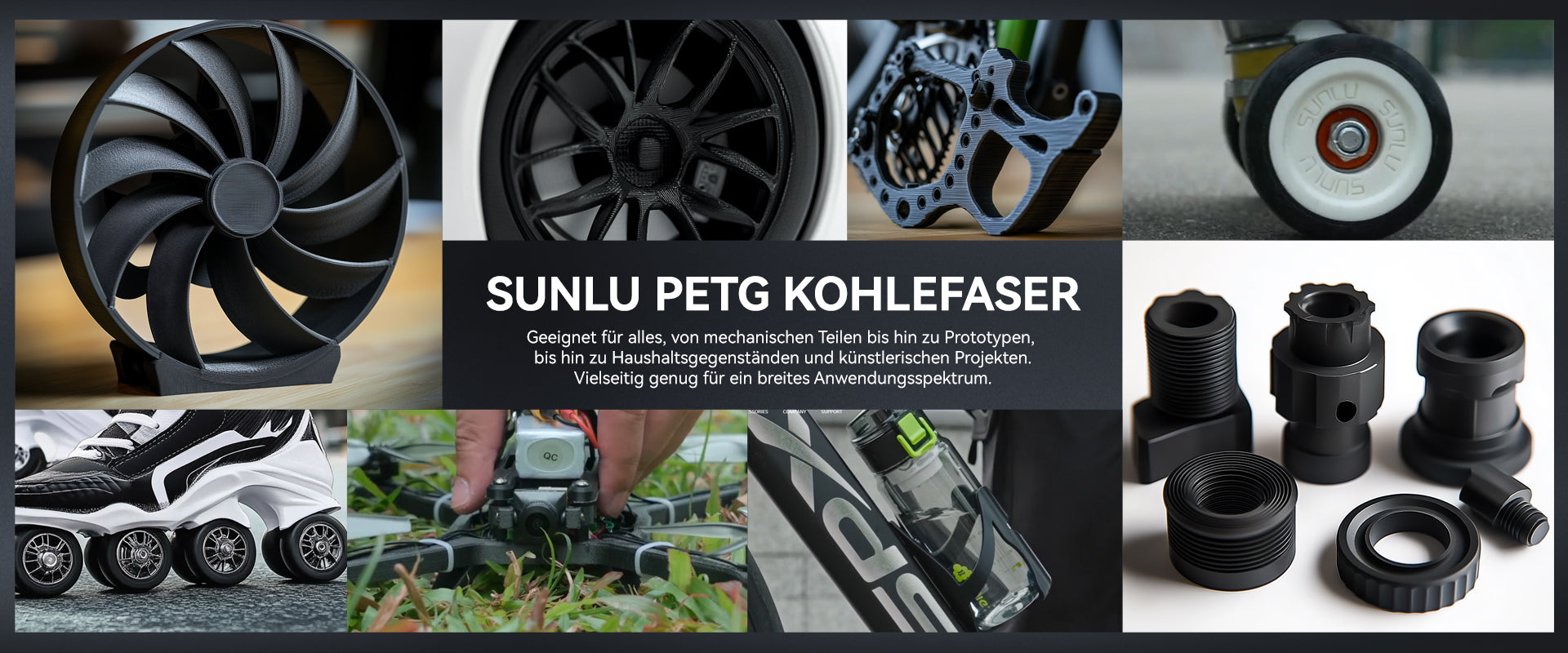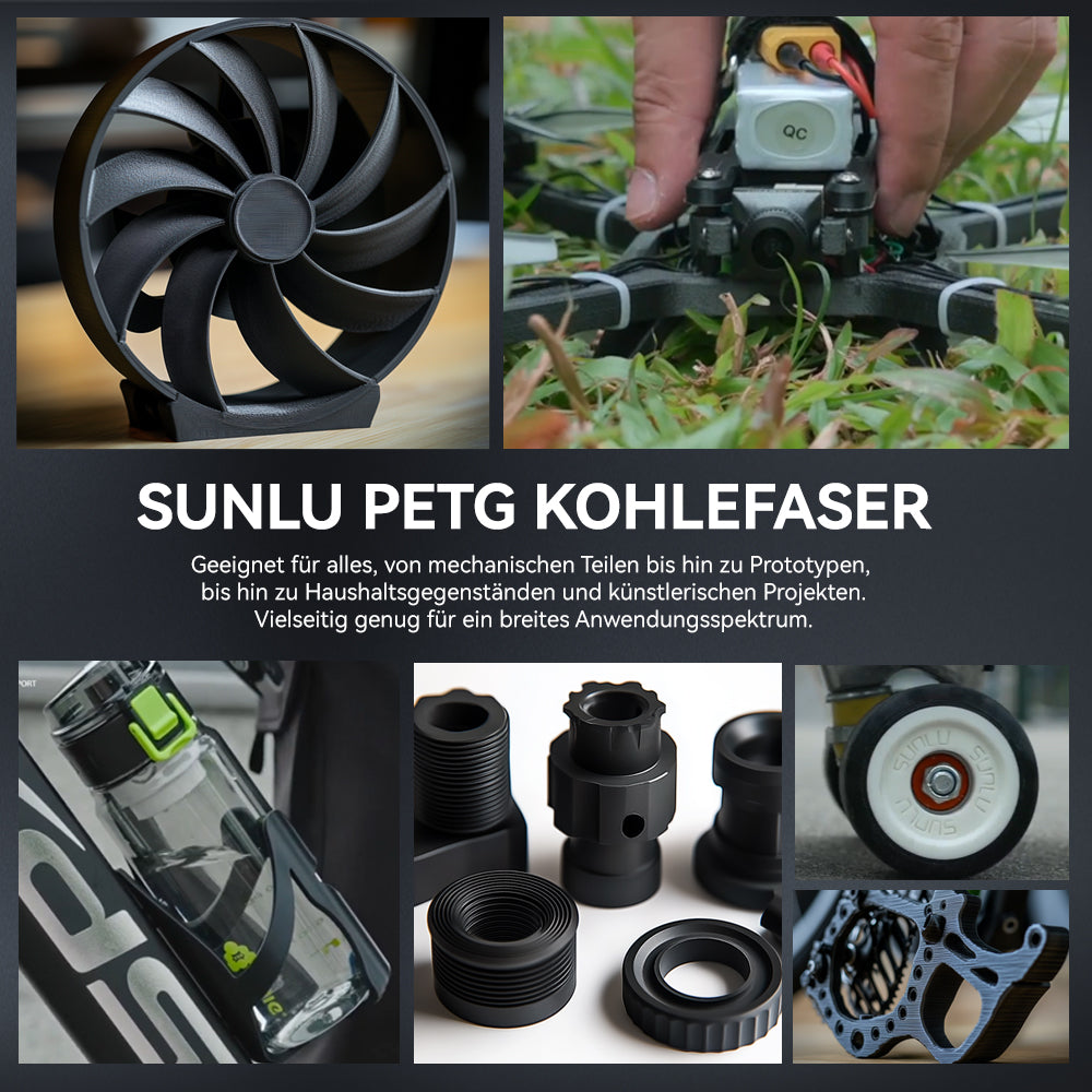 SUNLU PETG-CF-Filament ist mit 10 % Kohlenstofffasern durchsetzt und bietet außergewöhnliche Festigkeit und Steifigkeit. Ideal für industrielle Anwendungen wie Drohnenrahmen, Werkzeuge, Automobilkomponenten und Strukturteile.