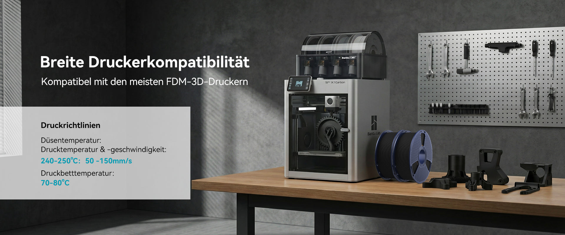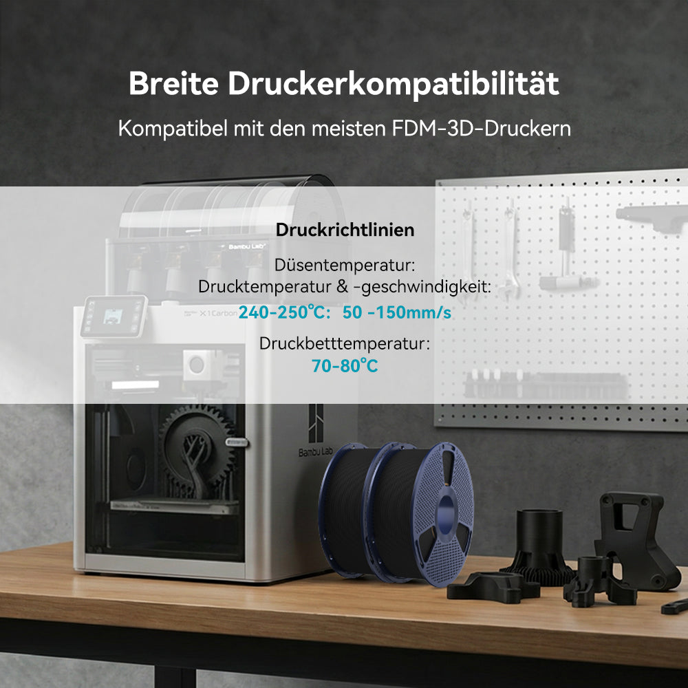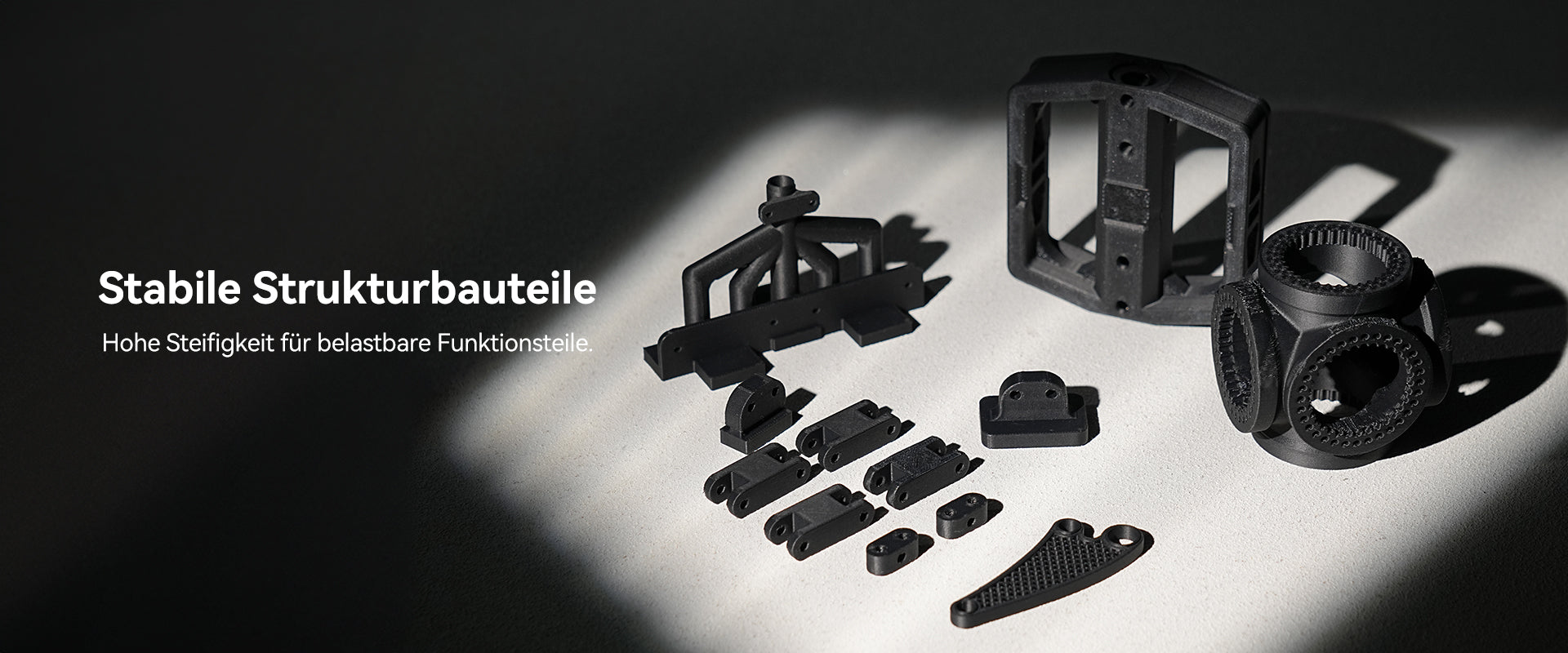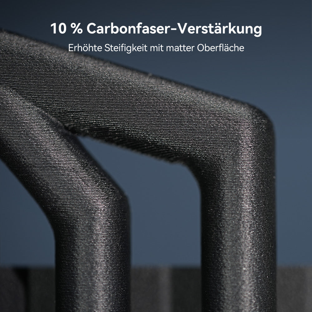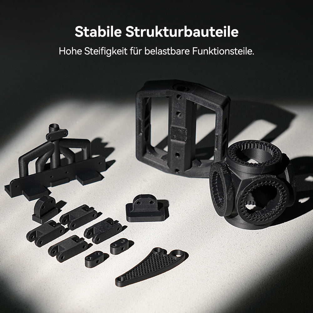 Die Verstärkung mit Kohlefaser erhöht die Zähigkeit von PETG erheblich und erzielt eine beeindruckende Schlagfestigkeit von 19 kJ/m². Dadurch sind die gedruckten Modelle langlebig, rissbeständig und ideal für anspruchsvolle Anwendungen geeignet.