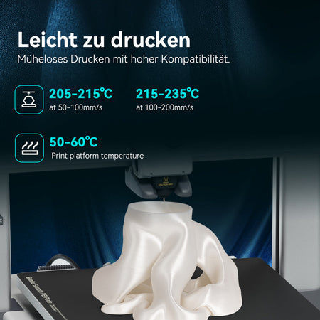 [Wir empfehlen den Druck] bei einer Düsen-/Extrusionstemperatur von 210°C - 235°C (410°F - 455°F) und einer Bett-/Plattformtemperatur von 55°C - 65°C (131°F - 149°F).