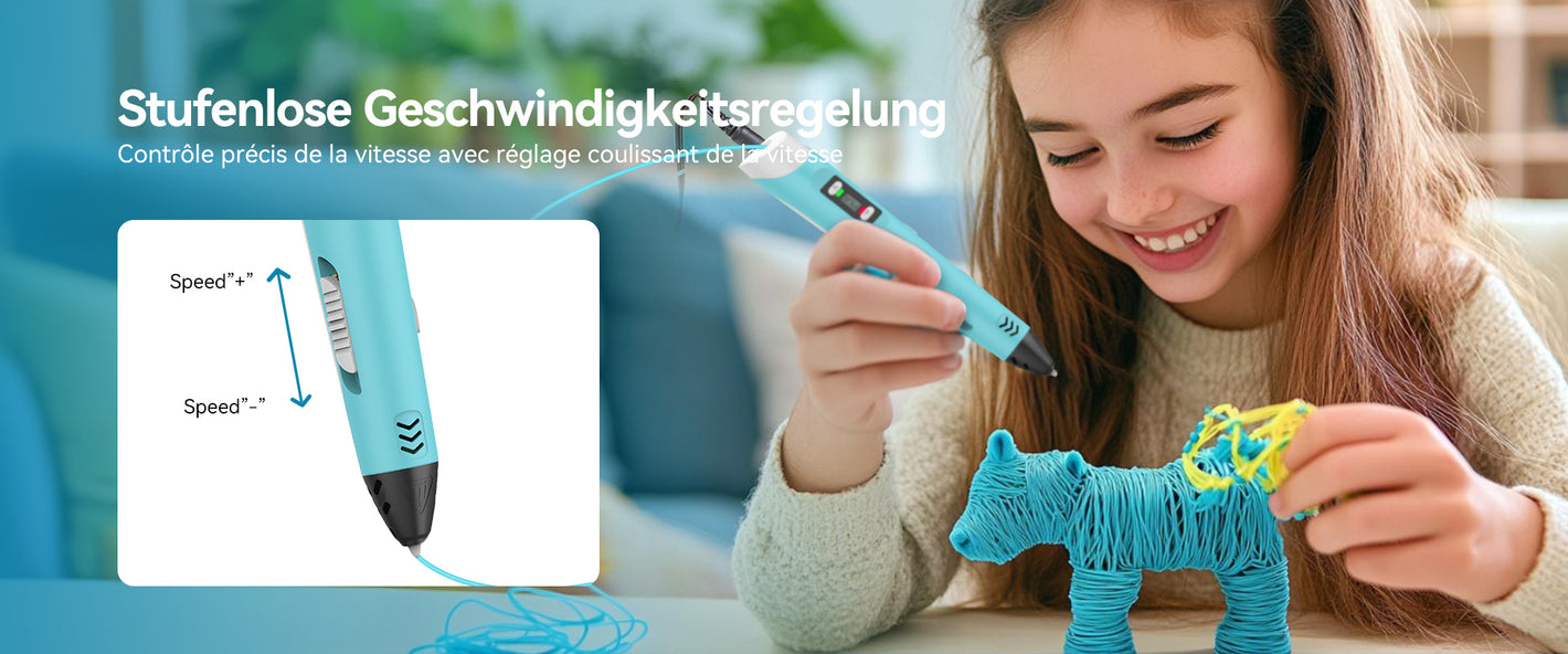 Der Stift ist mit mehreren Tasten ausgestattet, die eine einfache und intuitive Bedienung ermöglichen. Außerdem verfügt er über eine Frontabdeckung mit Drehknopf, die Wartung und Filamentwechsel schnell und problemlos macht. Die Geschwindigkeitskontrolle wird durch einen einstellbaren Schieberegler präzisiert, so dass Sie Ihre Zeichengeschwindigkeit genau steuern können.