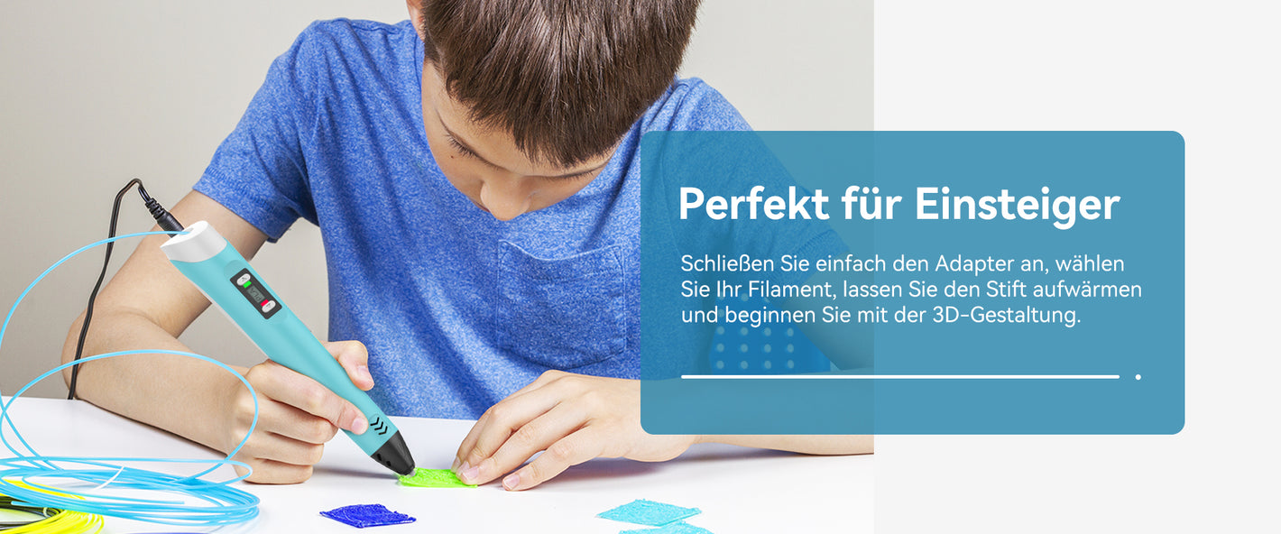 Stecken Sie einfach den Adapter ein, wählen Sie das Filament aus, lassen Sie den Stift aufwärmen und beginnen Sie mit der 3D-Kreation mit Leichtigkeit!