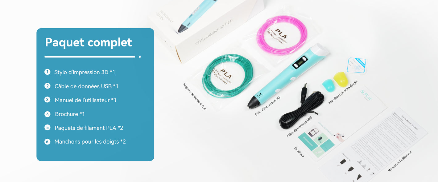 Ihr SL-200-Paket enthält alles, was Sie brauchen, um sofort mit dem Zeichnen zu beginnen: den Stift selbst, ein Netzteil (EU-, US- und UK-Standard verfügbar), ein USB-Datenkabel, ein Benutzerhandbuch, eine Broschüre, zwei Packungen PLA-Filament und zwei Fingerhüllen. Das Produkt ist ROHS-, FCC- und CE-zertifiziert und garantiert somit höchste Qualität und Sicherheit.