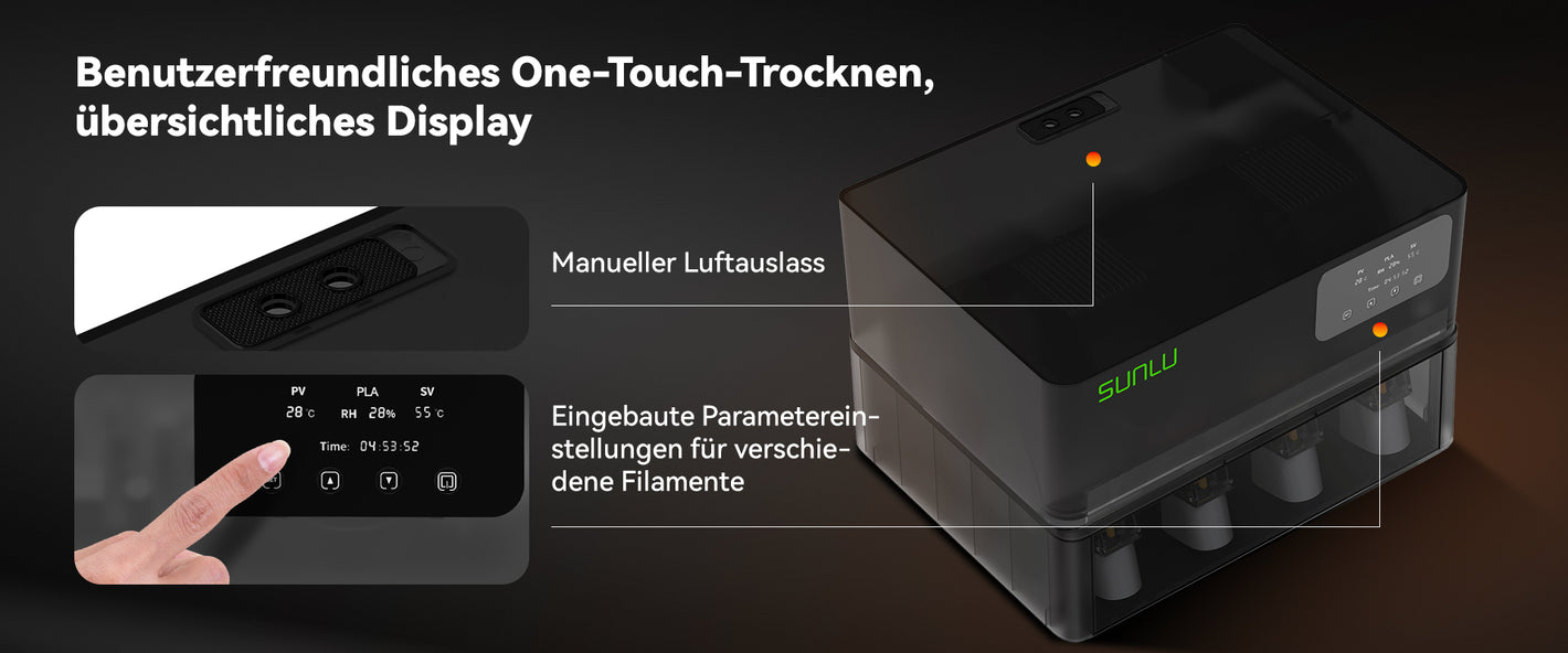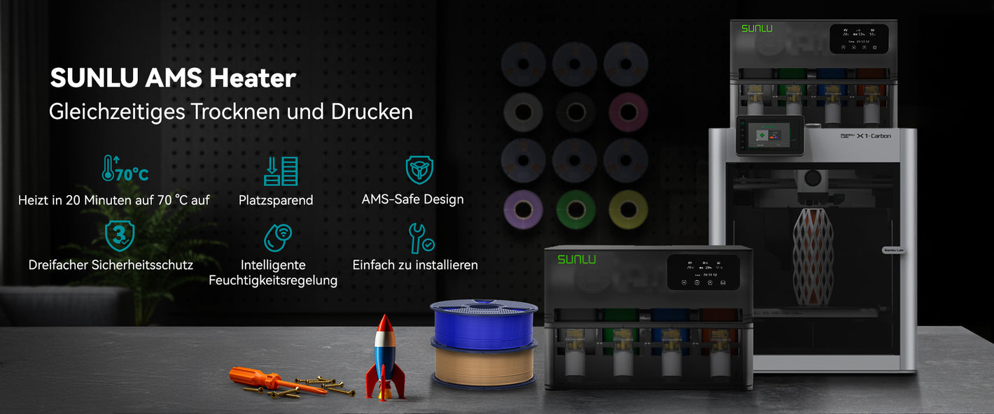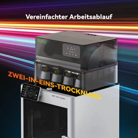 Trocknen und Drucken erfolgen gleichzeitig. Dies ist eine Heizvorrichtung, mit der die obere Abdeckung des AMS aufgerüstet werden kann. Im Vergleich zum herkömmlichen Druckverfahren mit dem AMS, bei dem vor dem Drucken getrocknet werden muss, ermöglicht die aufgerüstete Version das gleichzeitige Drucken und Trocknen.