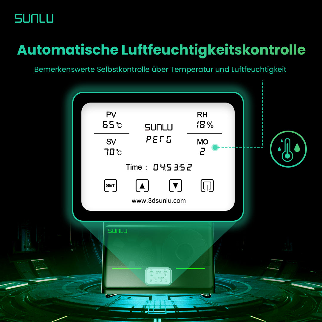 Heizt nicht nur bis zu 70'C, sondern kontrolliert auch die LuftfeuchtigkeitDie Innenwärme wird mit drei Lüftern effizient umgewälzt, wodurch ein Gleichgewichtsgrad von +3C erreicht wird. Die acht Filamentlöcher leiten die Feuchtigkeit aus dem Inneren des Geräts ab und verhindern die Ansammlung von Feuchtigkeit. Mit all diesen Maßnahmen wird sichergestellt, dass die Temperatureinstellung des Geräts der tatsächlichen Temperatur entspricht.