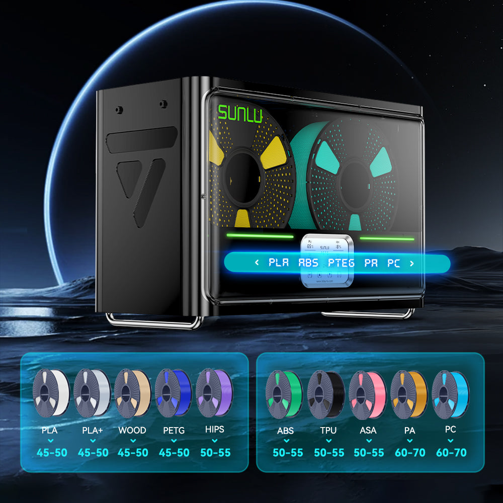 SUNLU Filadryer S4 comes with pre-configured temperature settings of commonly used filaments such as PLA, ABS, PETG, as well as TPU, PA and PC. These configurations are based on testing data, providing optimal drying time and temperature. By expanding options while reducing setup complexities, we aim to improve your experience.