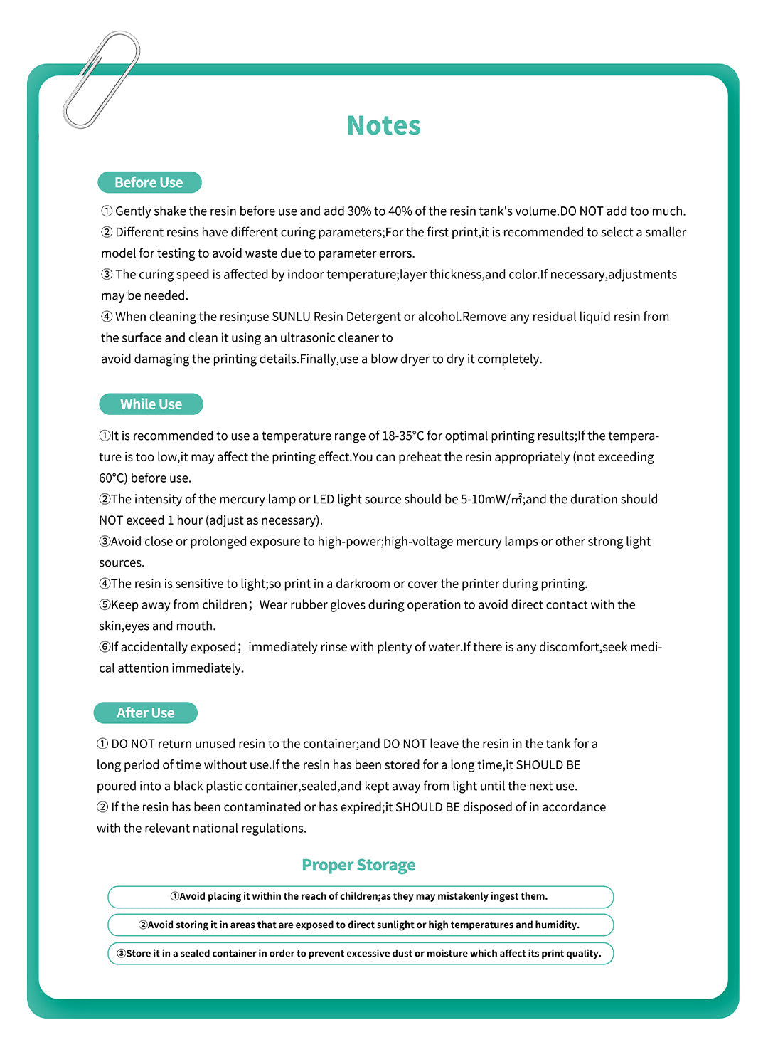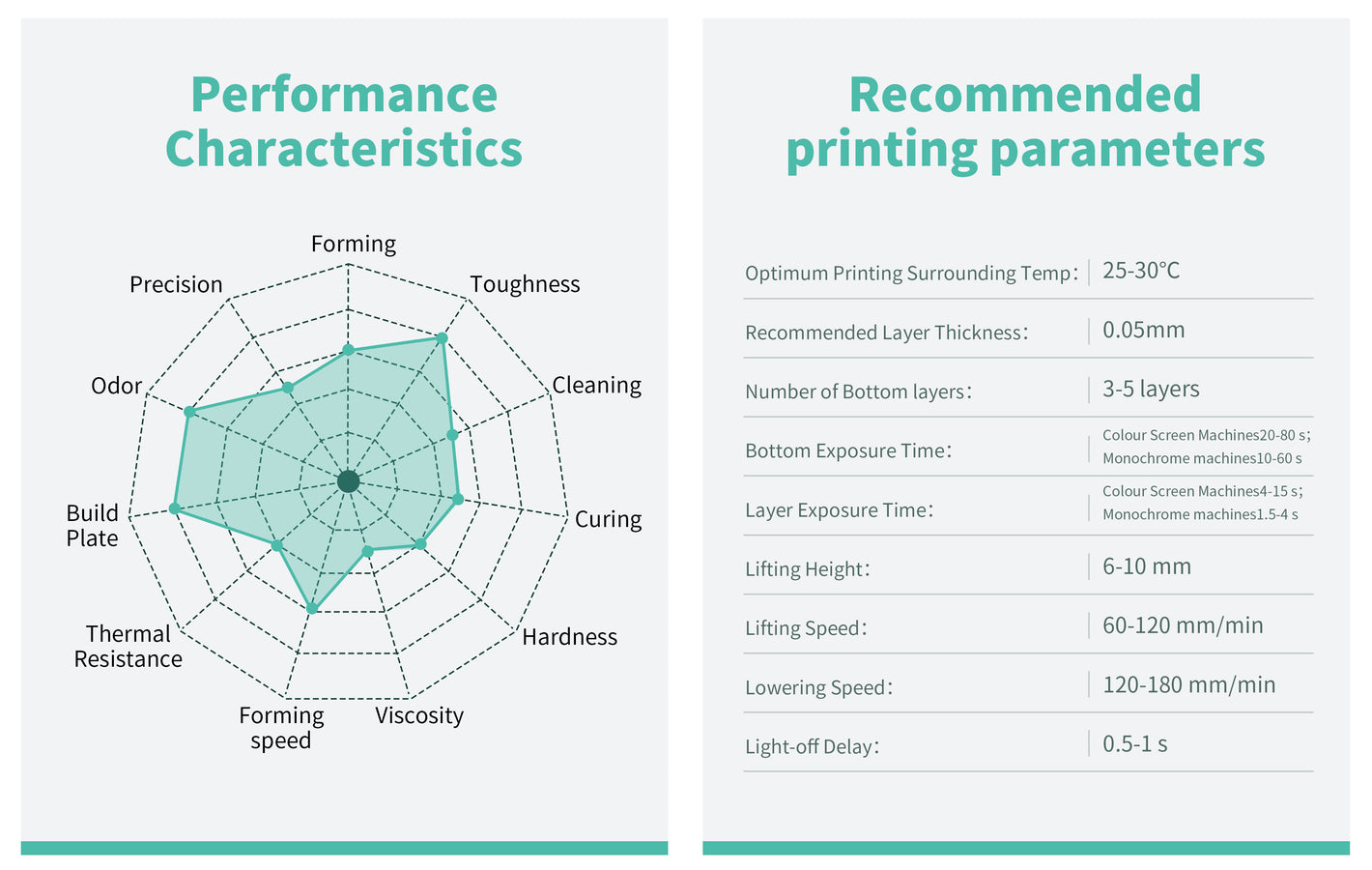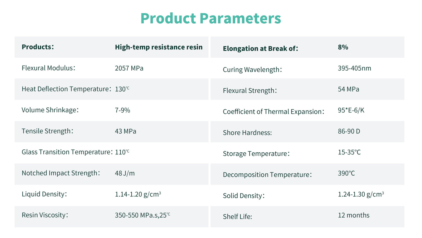 Gute Temperaturbeständigkeit: Es kann bis zu 180℃/15 Minuten, 150℃/1 Stunde und 80℃/7 Tage widerstehen. Gedruckte Modelle besitzen eine hohe thermische Stabilität, die Rissbildung und Verformung bei hohen Temperaturen verhindert.