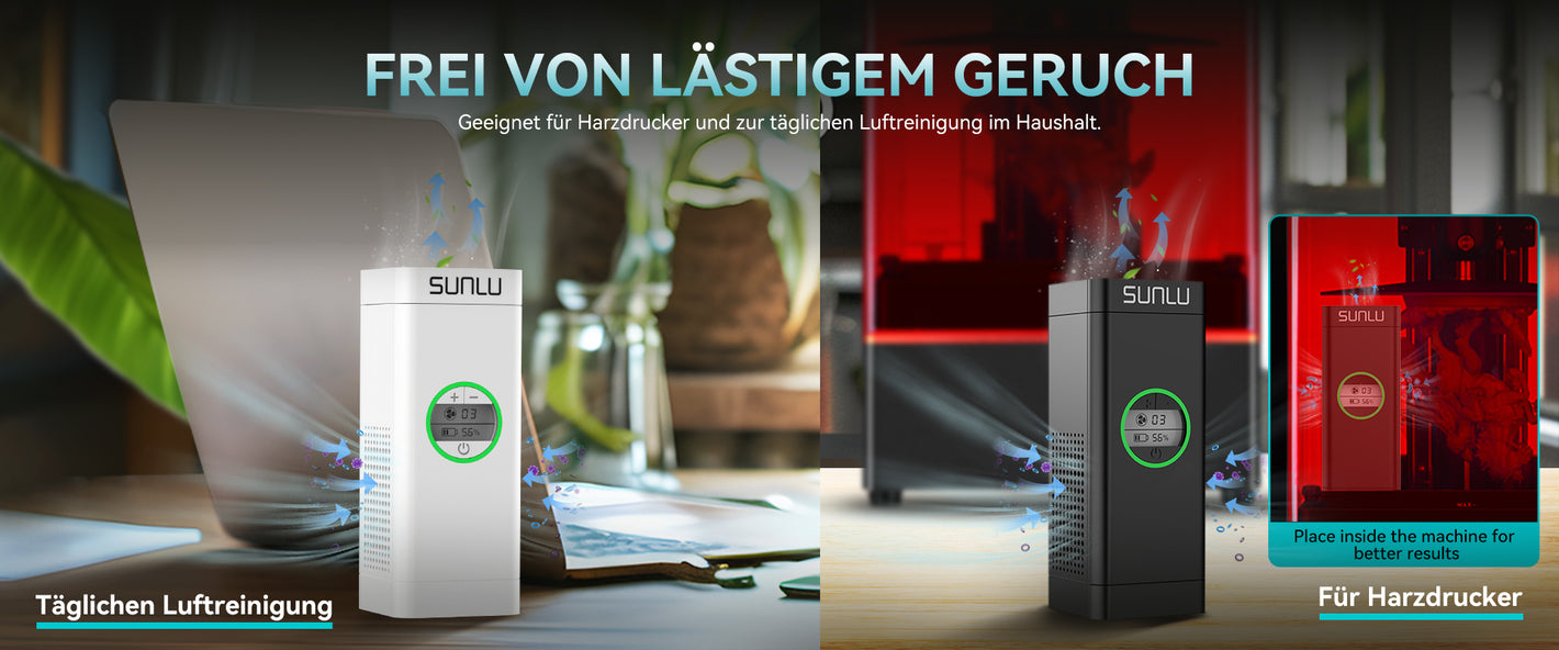 Der Luftreiniger kann helfen, Luftschadstoffe wie Staub, Pollen, Rauch, Tierhaare und Gerüche aus Ihrem Haus oder Büro zu entfernen. Er kann auch mit Harzdruckern arbeiten. Dies kann die Luftqualität in Innenräumen verbessern und Allergikern oder Asthmatikern Linderung verschaffen. Sie sind kompakt und tragbar und daher ideal für kleinere Räume.