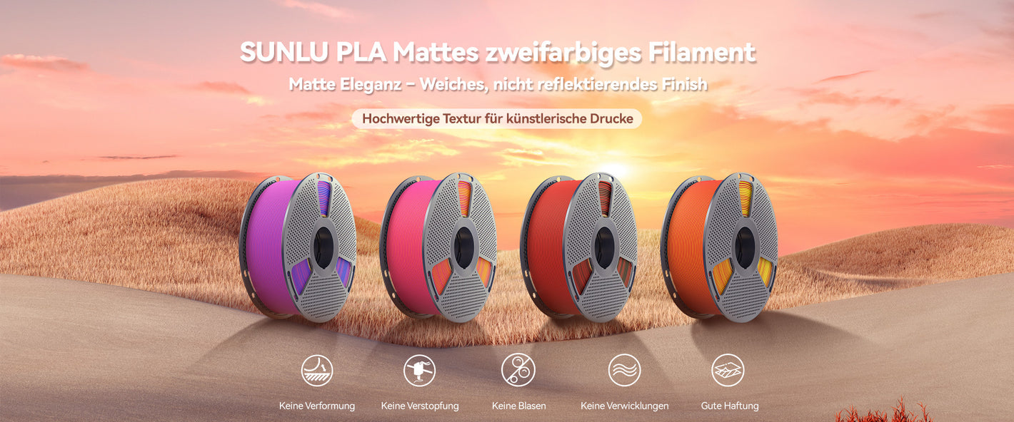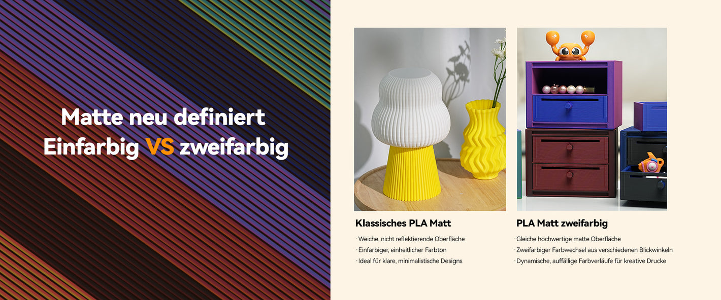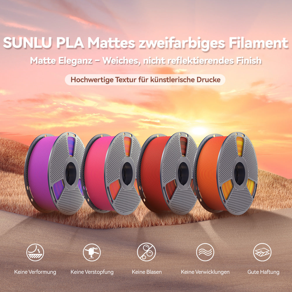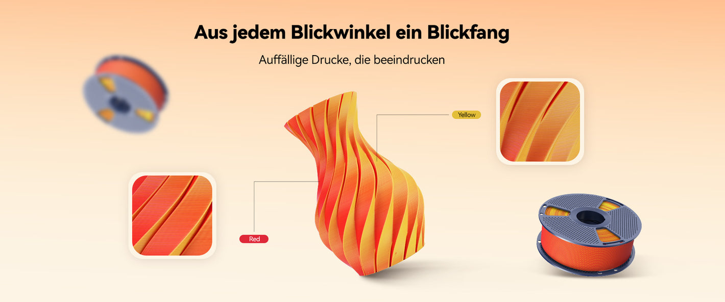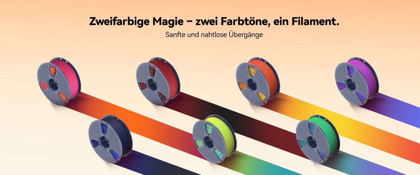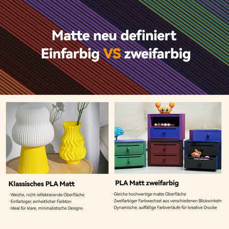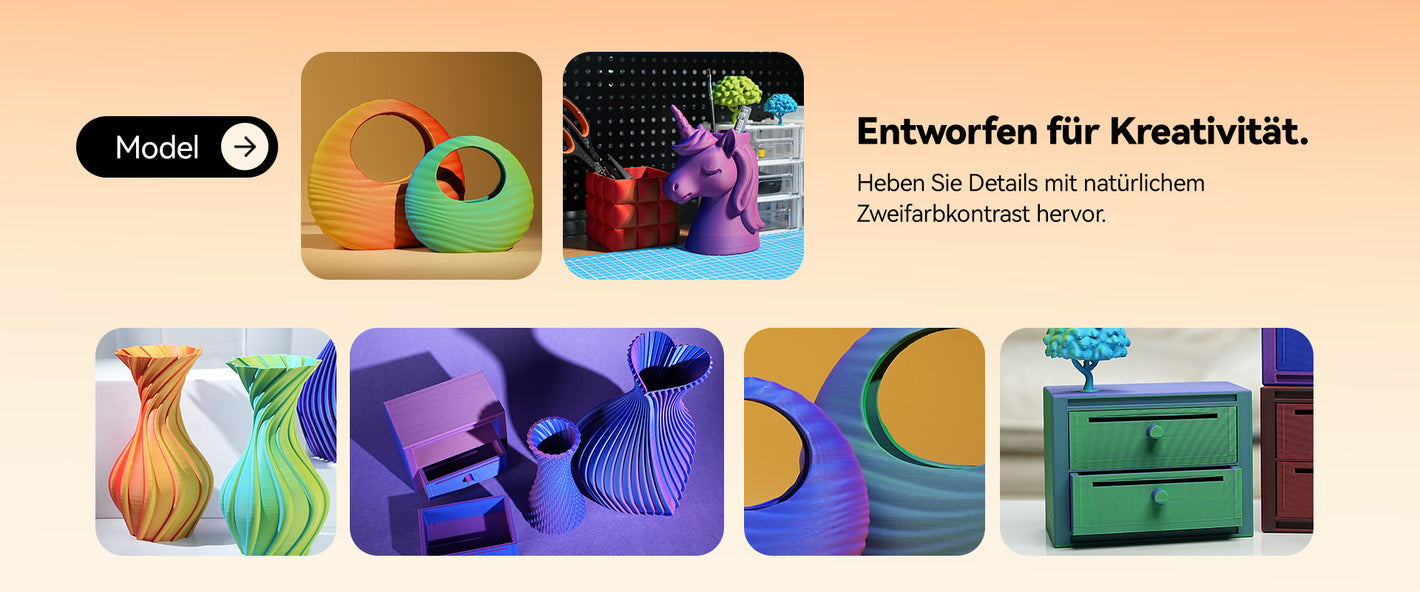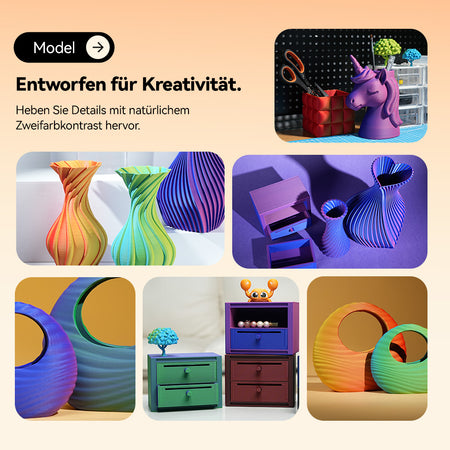 Das Filament erzeugt eine natürlich weiche, nicht reflektierende Oberfläche, die Blendungen verhindert. Perfekt für künstlerische und dekorative Drucke, bei denen eine edle matte Textur das Design aufwertet. Genießen Sie zwei unterschiedliche Farben in nur einem Filament. Verschiedene Flächen des Modells zeigen unterschiedliche Töne mit sanften, natürlichen Übergängen – ideal für einzigartige Accessoires, dekorative Kunstwerke und personalisierte Modelle.