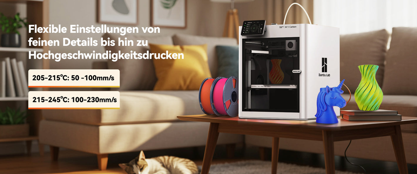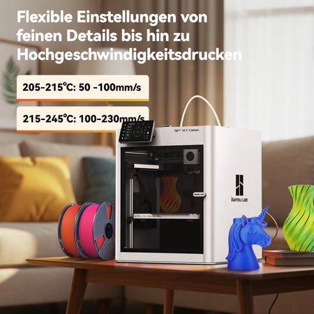 Kompatibel mit einem breiten Temperaturbereich (205–215°C bei 50–100 mm/s, 215–245°C bei 100–230 mm/s). Ob detailreiche Modelle im langsamen Druck oder größere Projekte bei hoher Geschwindigkeit – die Ergebnisse bleiben stabil und glatt. Starke Haftung ohne Kleber auf beheizten Druckplatten (50–60°C). Für unbeheizte Druckplatten wird eine dünne Klebeschicht empfohlen.
