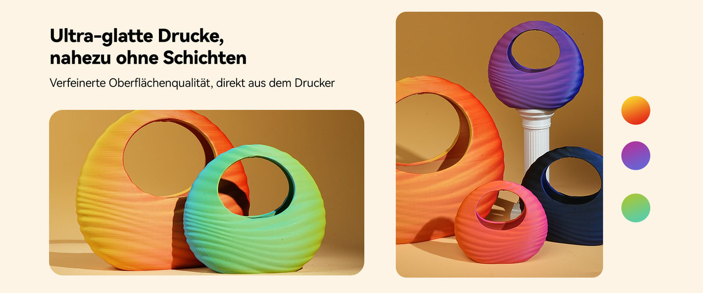 Die Farbverläufe sind weich und nahtlos, ohne harte Übergänge, und verleihen den Modellen ein edles, professionelles Aussehen. Entwickelt für besonders gleichmäßige Extrusion reduziert dieses Filament sichtbare Schichten und liefert ein poliertes Finish direkt vom Drucker – Nachbearbeitung wird kaum benötigt.